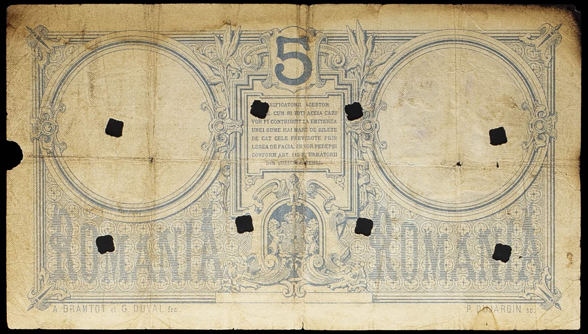 - ROMANIA 5 lei type “hypothécaire” (ANNULÉ / CANCELLED) 12 juin 1877.