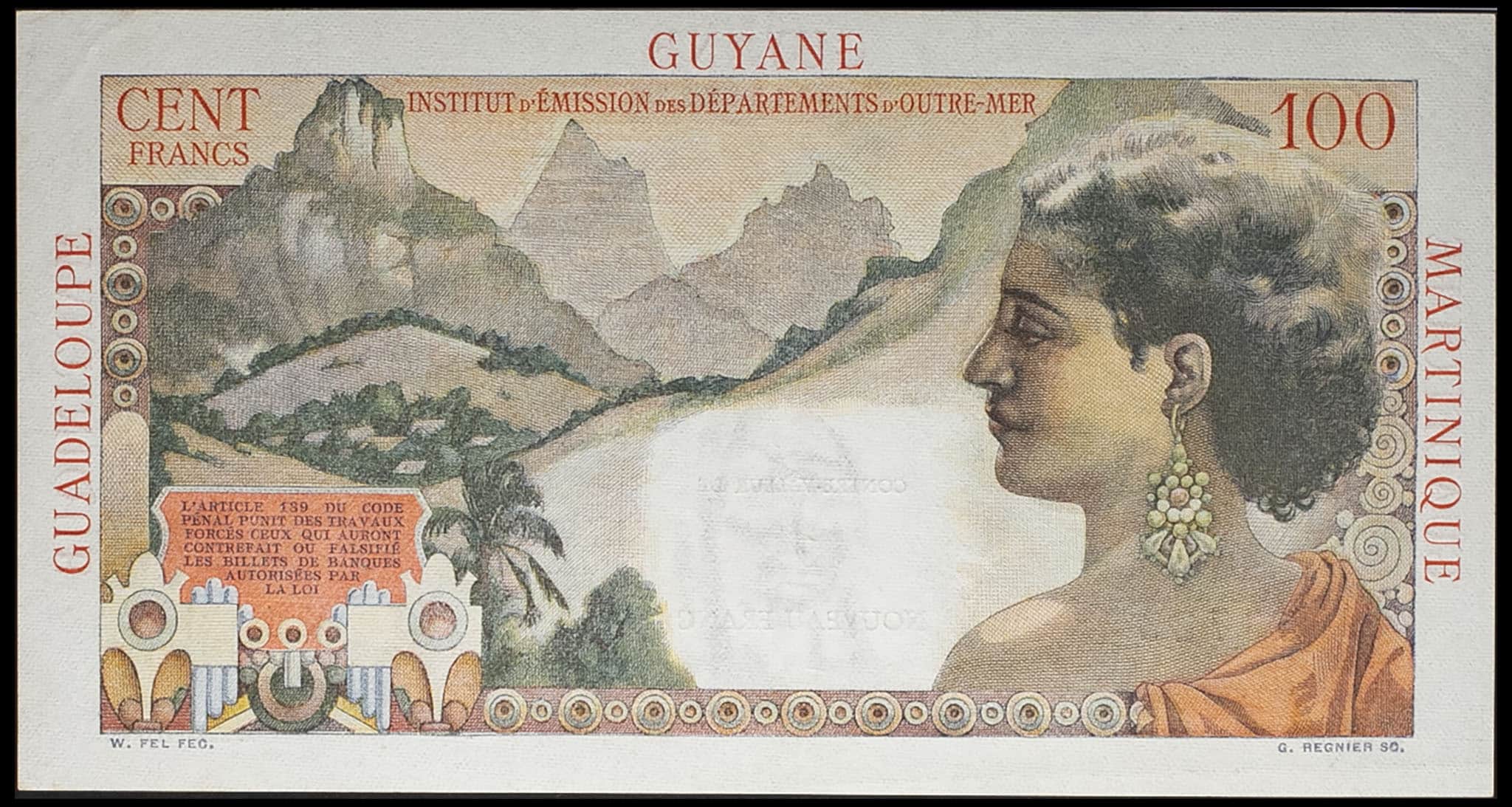 - FRENCH ANTILLES 1 nouveau franc surchargé sur 100 francs type “La Bourdonnais” ND (1960).