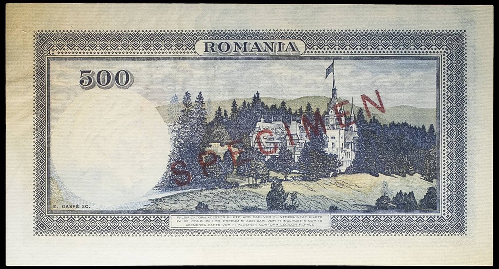 - ROMANIA 500 lei avec le portrait du roi Carol II (SPÉCIMEN) 30 avril 1936.