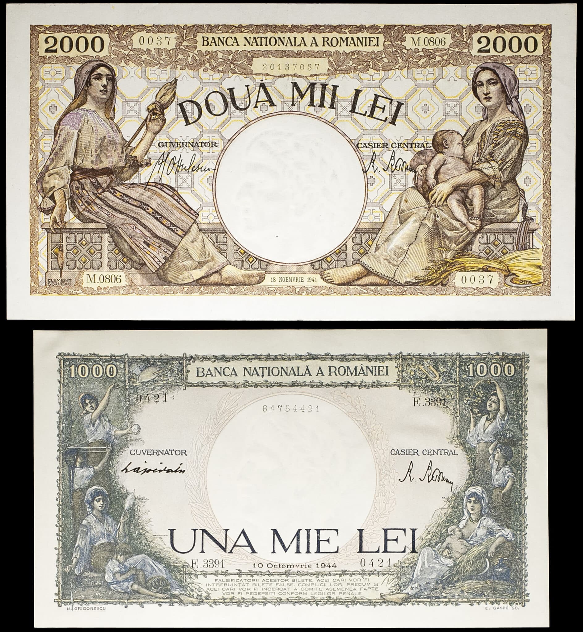 Lot de 2 billets. 1000 lei avec alphabet E.3391 - numéro 0421 (signatures : Lapedatu / Roman) et 2000 lei avec alphabet M.0806 - numéro 0037 (signatures : Ottulescu / Roman).