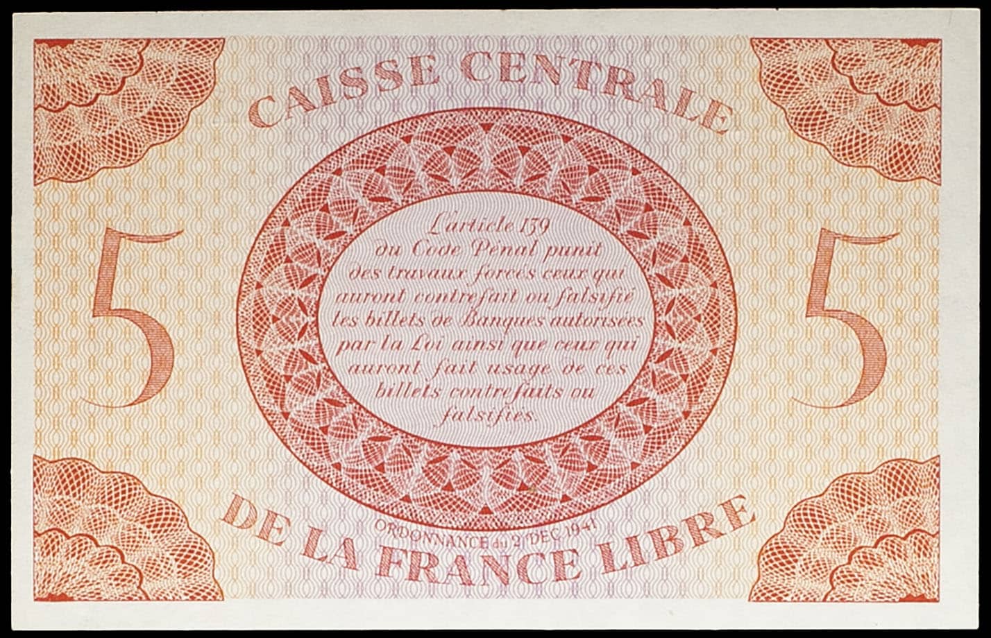 - SAINT PIERRE AND MIQUELON 5 francs type “Marianne” dit “Edmond Dulac” - Caisse centrale de la France libre 2 décembre 1941 (20 janvier 1943).