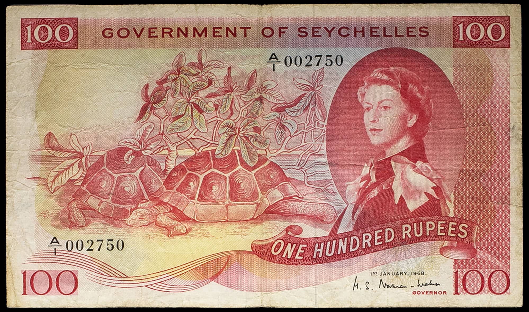 - 100 rupees avec le portrait de la reine Élisabeth II 1er janvier 1968.