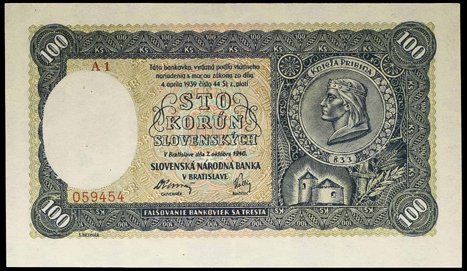 - SLOVAKIA 100 korun avec le portrait du prince Pribina 7 octobre 1940.