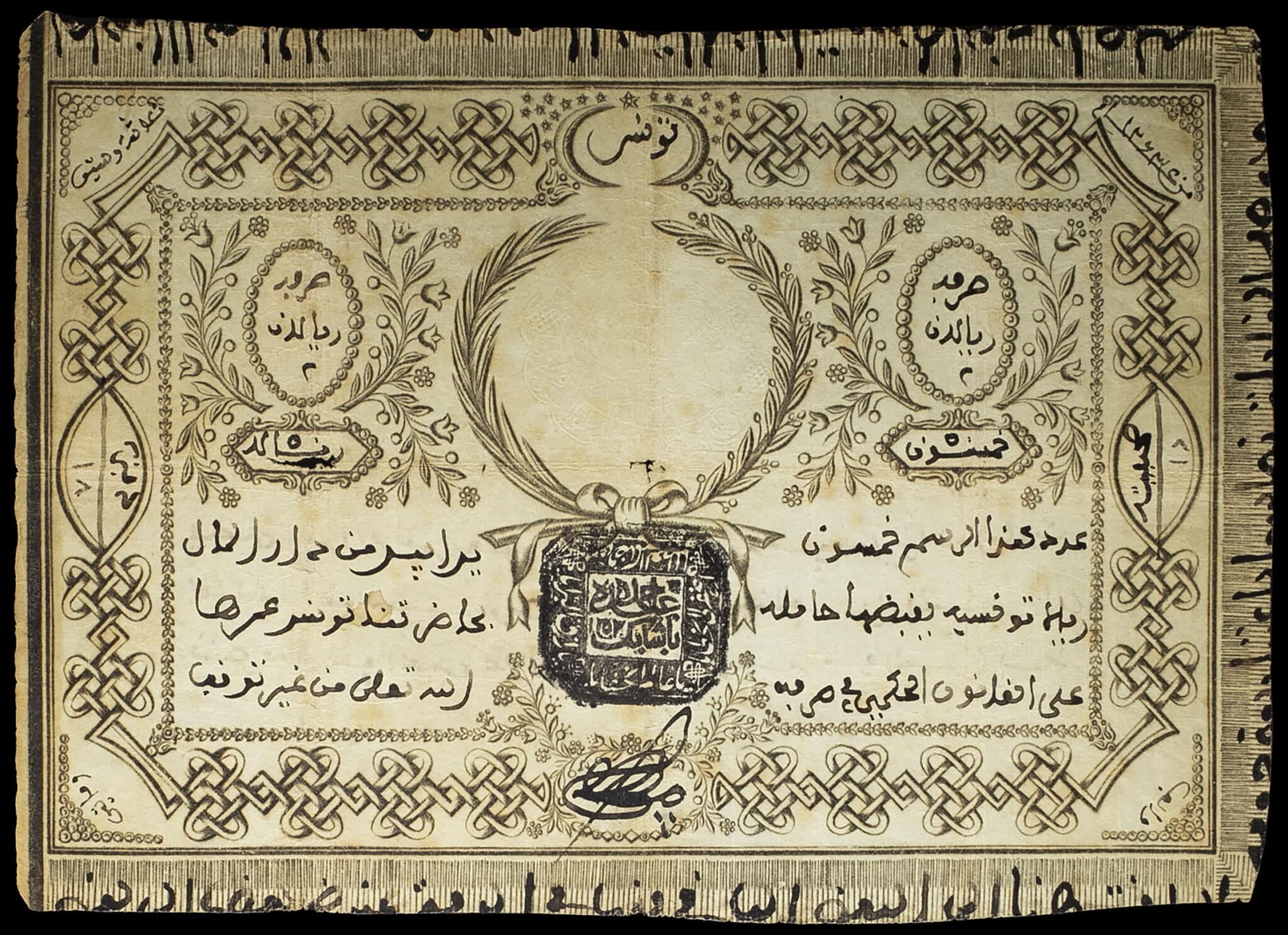 - TUNISIA Beylicat de Tunis (administration ottomane), 50 riyals ND (1846 / AH 1263).