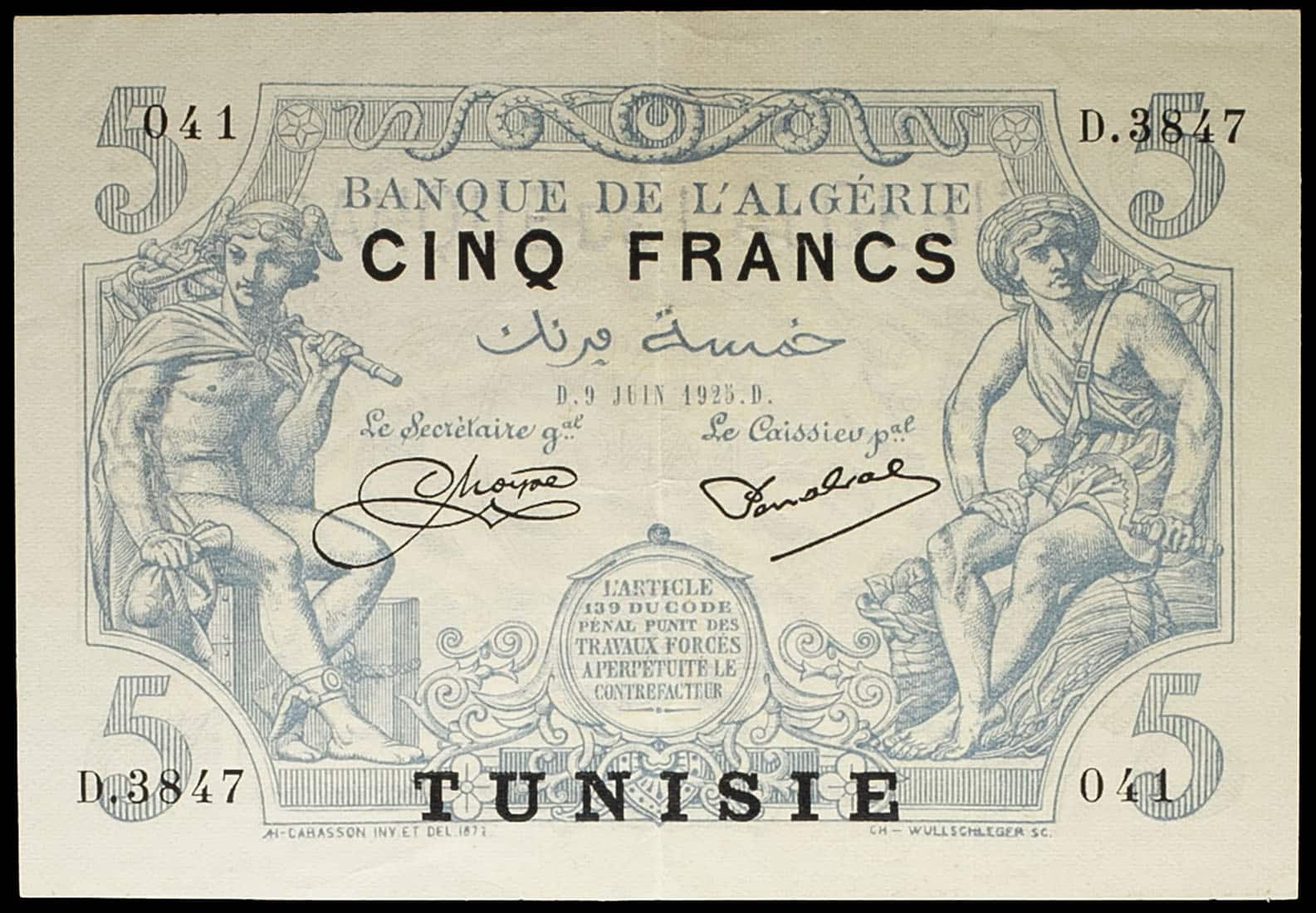 - TUNISIA 5 francs type “bleu” - Banque de l’Algérie 9 juin 1925.