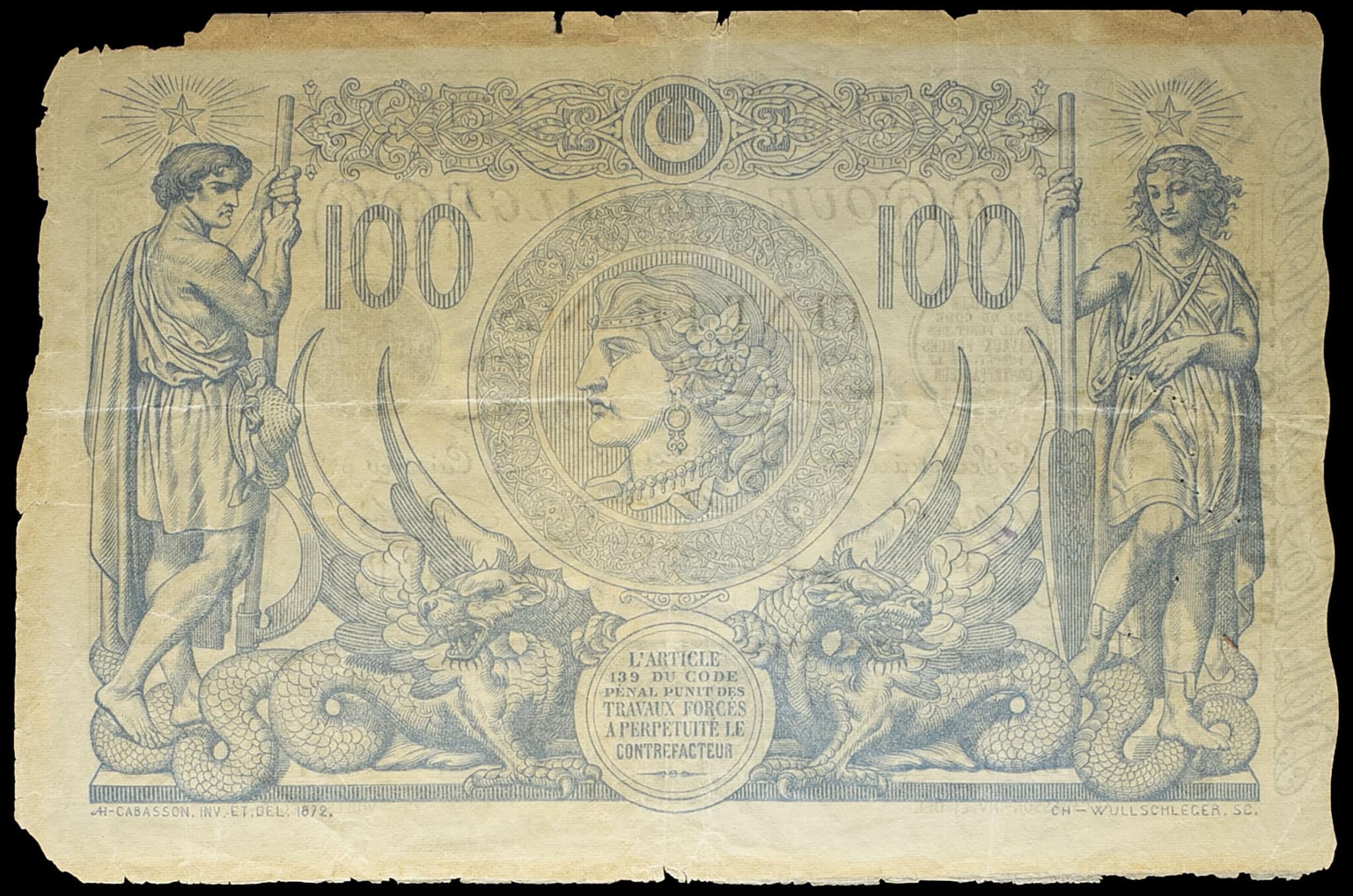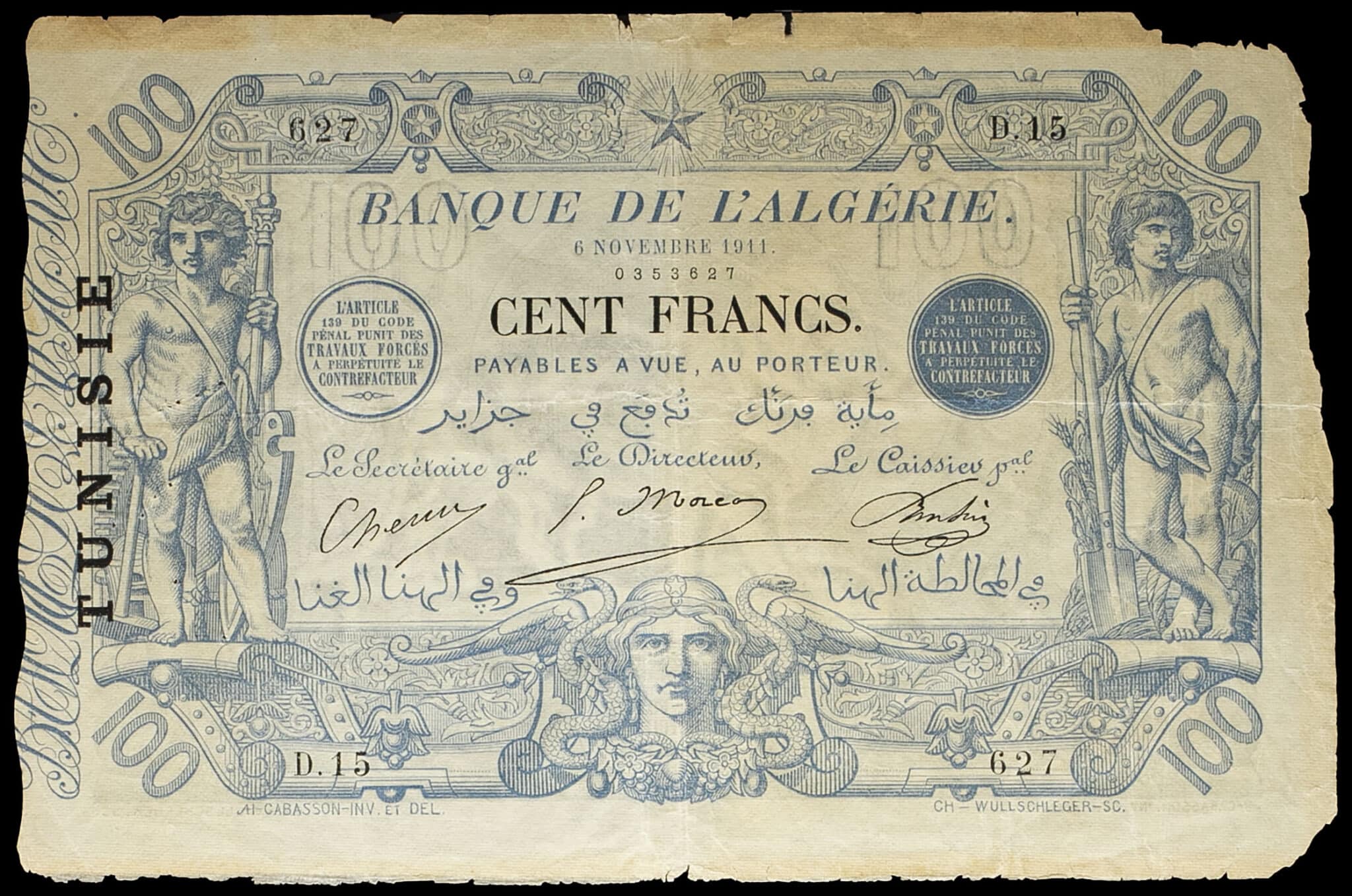 - TUNISIA 100 francs type “bleu” modifié - Banque de l’Algérie 6 novembre 1911.