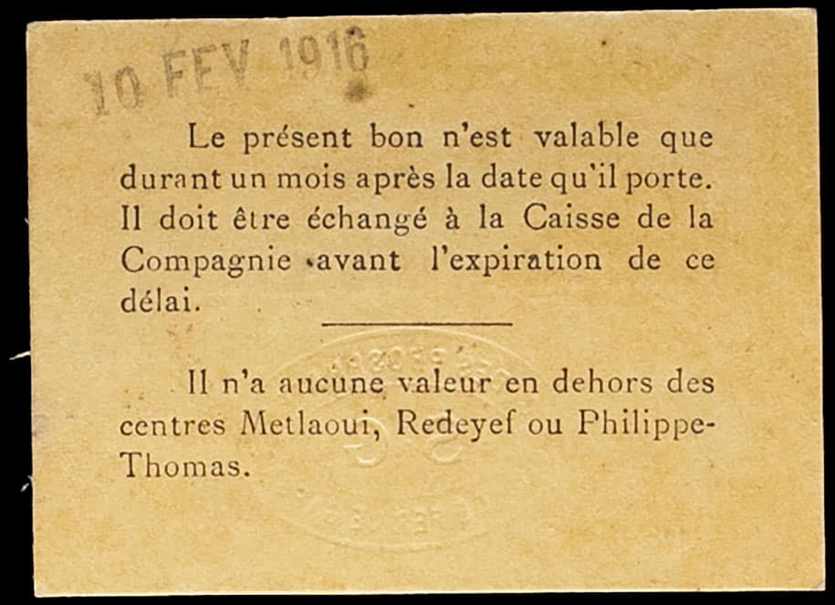 Pas d’alphabet - numéro 6212. C’est l’exemplaire qui illustre “Les Billets du Maghreb et du Levant” de Maurice Muszynski et Maurice Kolsky (p. 220). Ces cartons de la Compagnie des Phosphates et du Chemin de Fer furent retirés de la circulation en fin 1918. Pedigree : provient de la collection Maurice Kolsky.