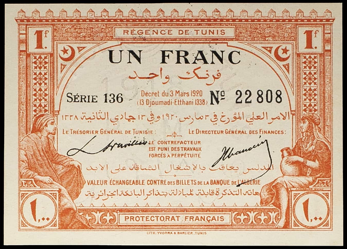- TUNISIA 1 franc type “Régence de Tunis”, septième émission 3 mars 1920.