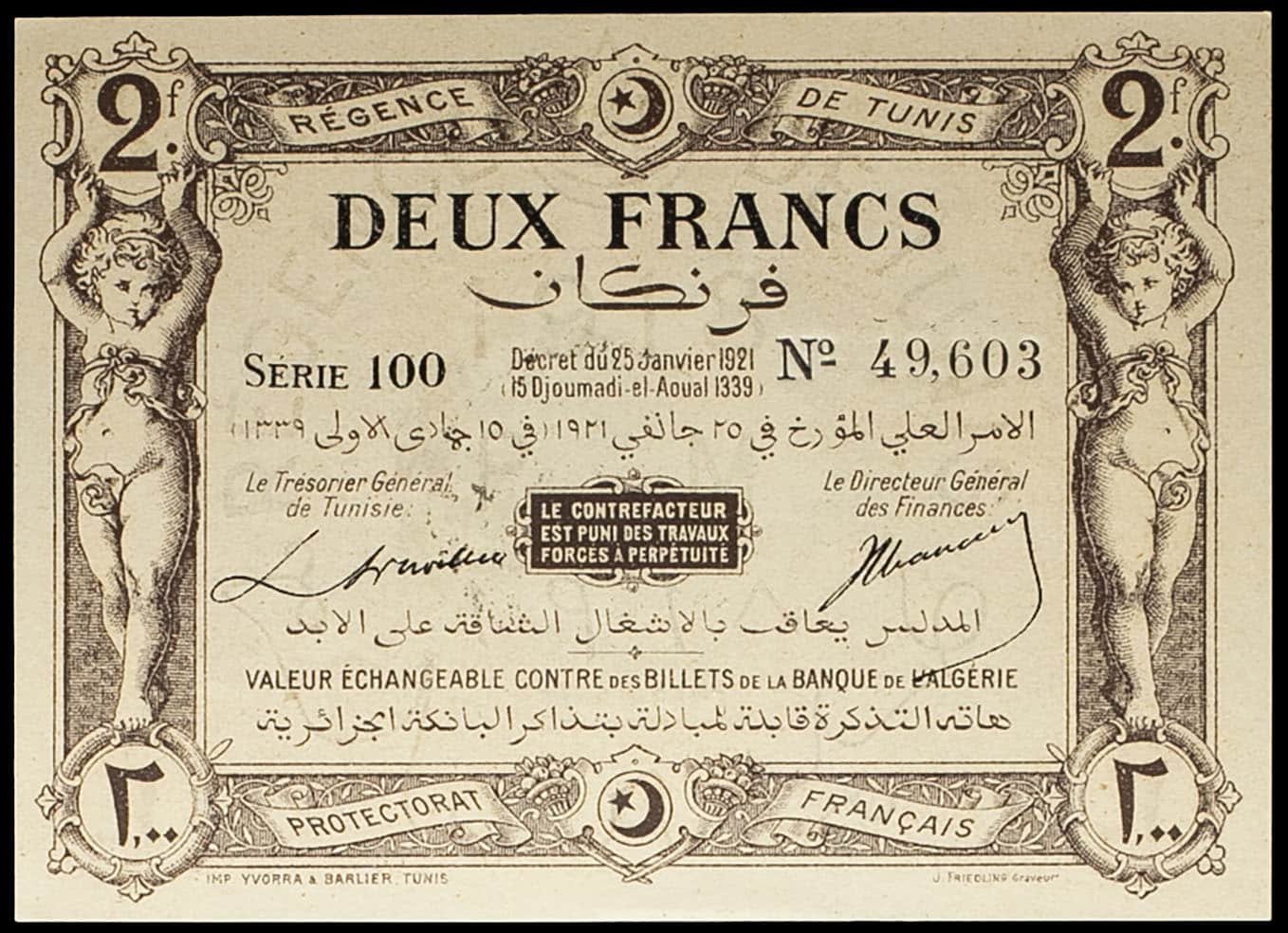 - TUNISIA 2 francs type “Régence de Tunis”, huitième émission 25 janvier 1921.