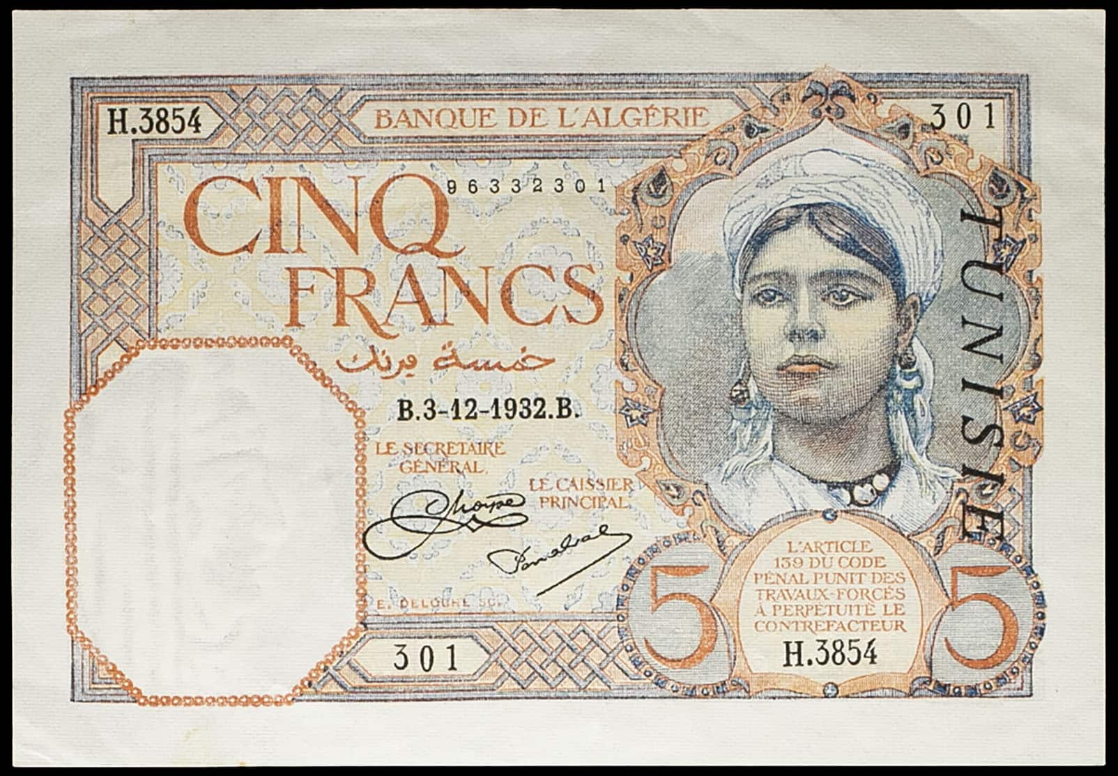 - TUNISIA 5 francs - Banque de l’Algérie 3-12-1932.