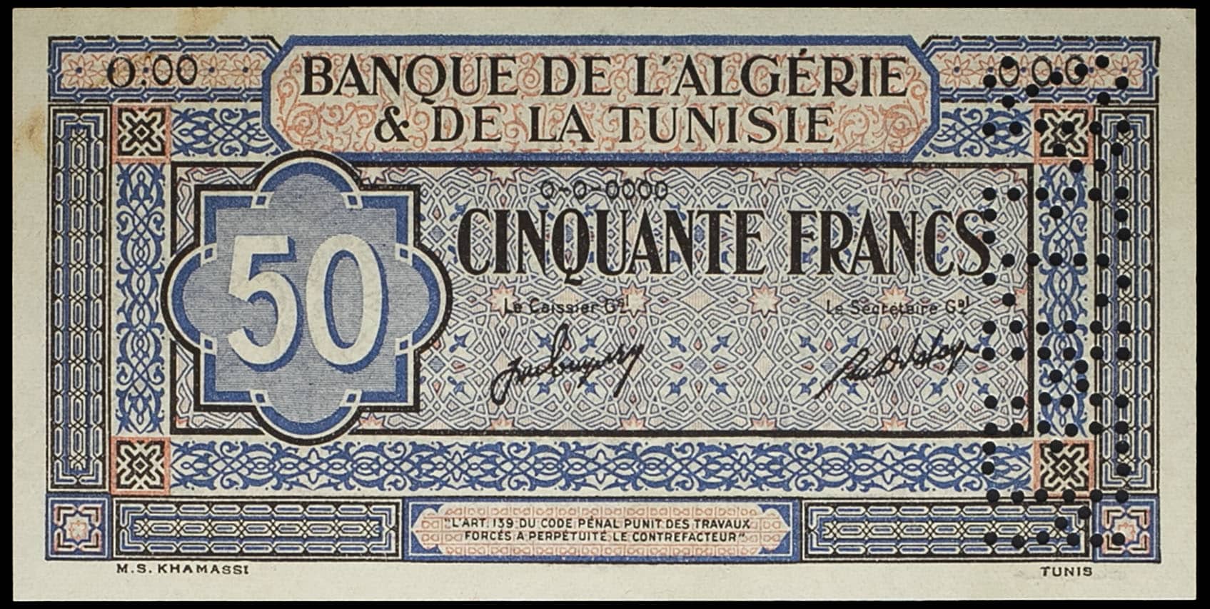 - TUNISIA 50 francs type “Khamassi” (SPÉCIMEN) - Banque de l’Algérie & de la Tunisie ND (1949).