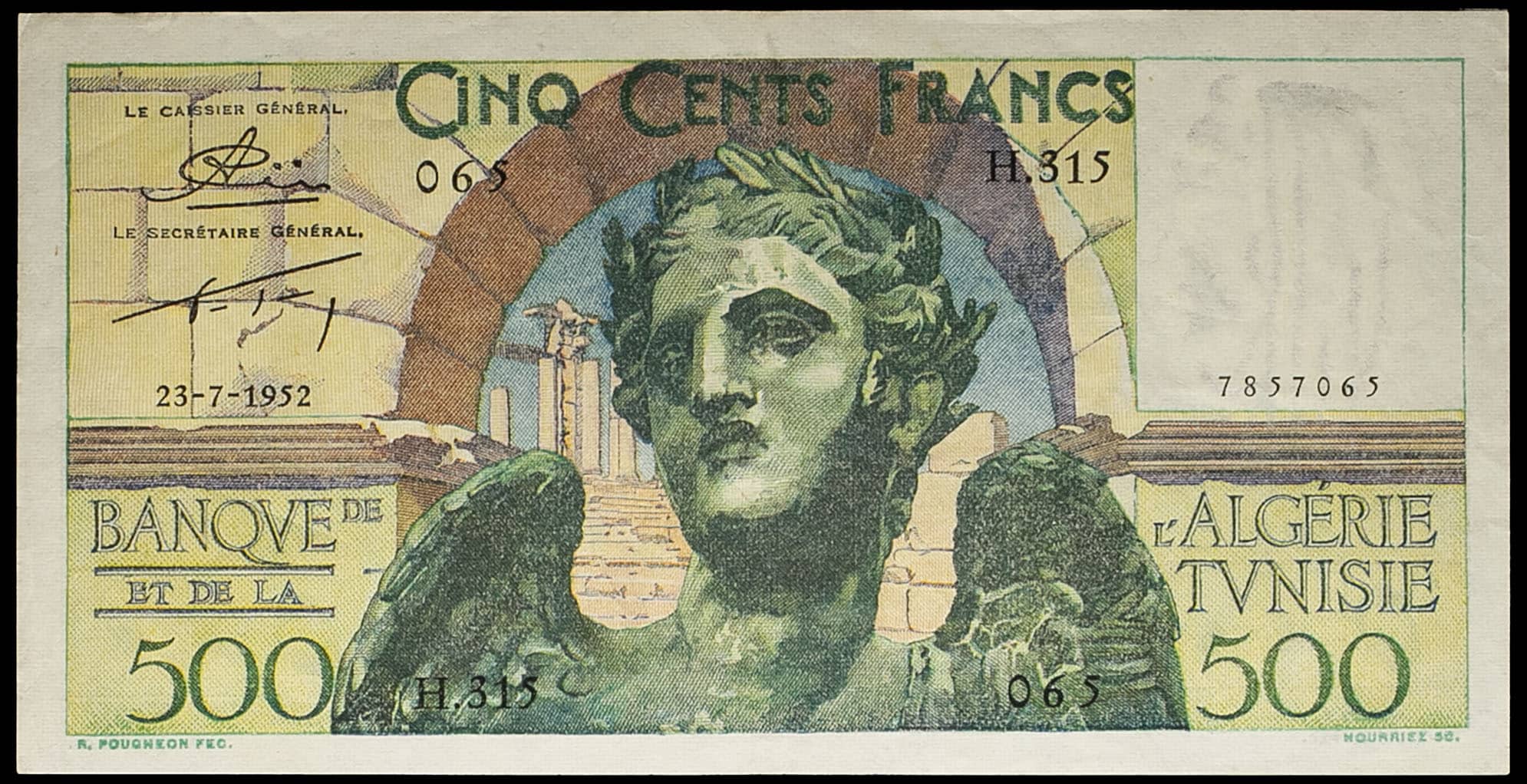 - TUNISIA 500 francs type “Victoire ailée” modifié - Banque de l’Algérie-Tunisie 23-7-1952.