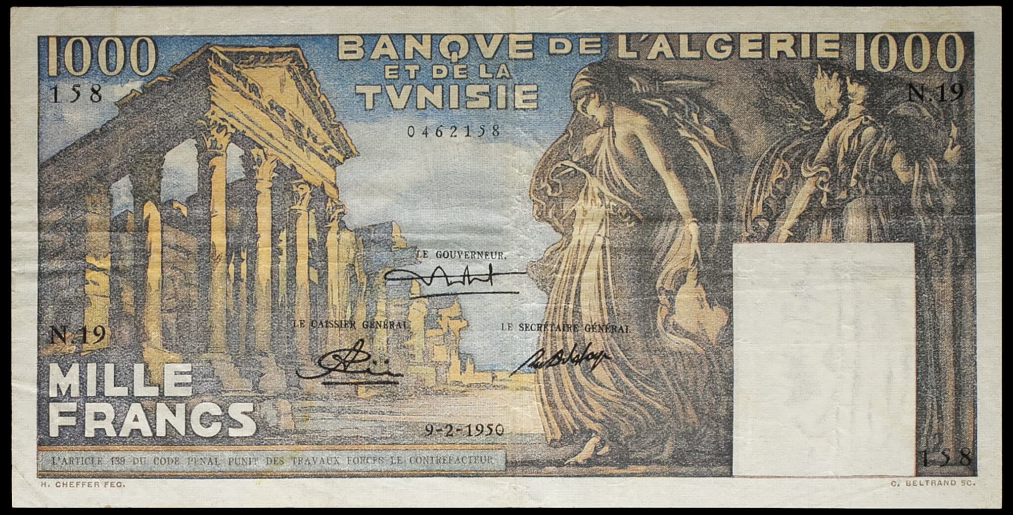 - TUNISIA 1000 francs type “temple romain” - Banque de l’Algérie et de la Tunisie 9-2-1950.