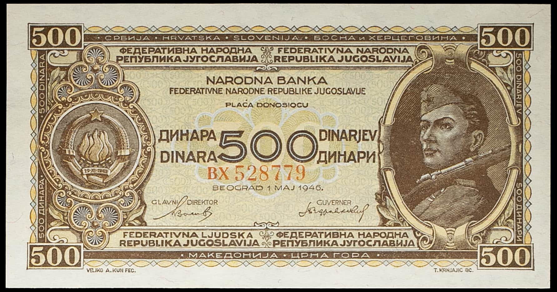 - YUGOSLAVIA 500 dinara avec le portrait de Milivoje Rodić 1er mai 1946.