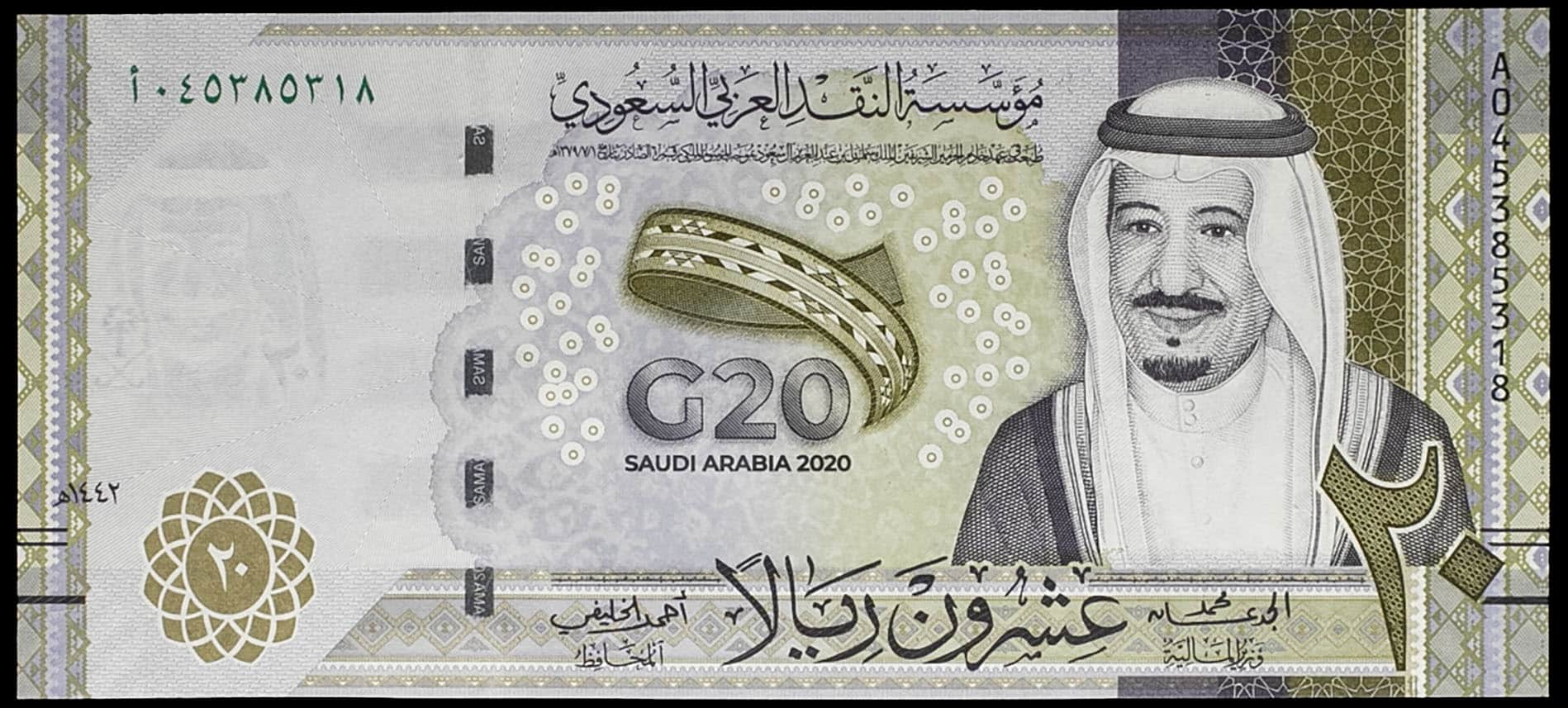 - SAUDI ARABIA 20 riyals avec le portrait du roi Salmane, type commémoratif “sommet du G20” 2020 / AH 1441.
