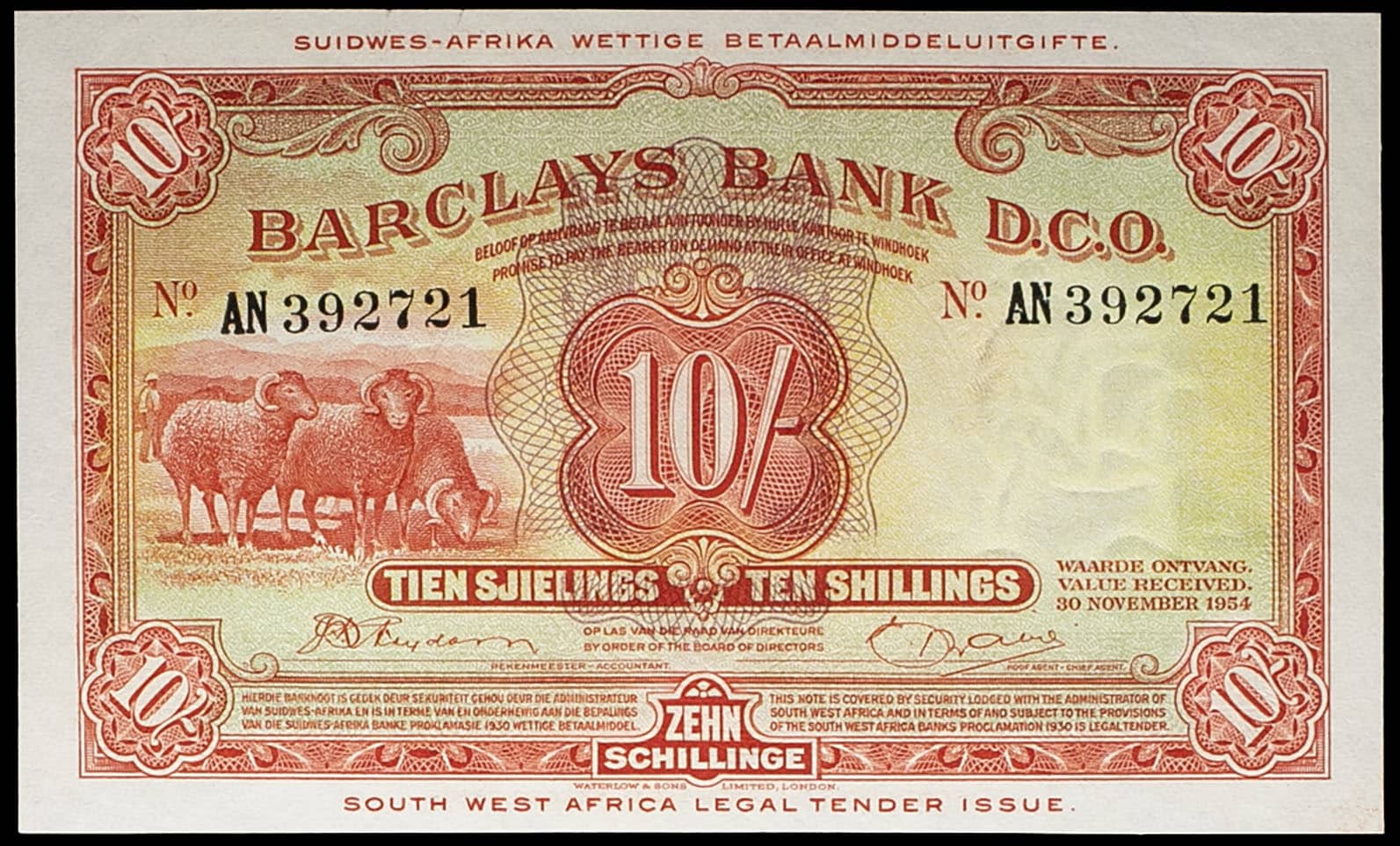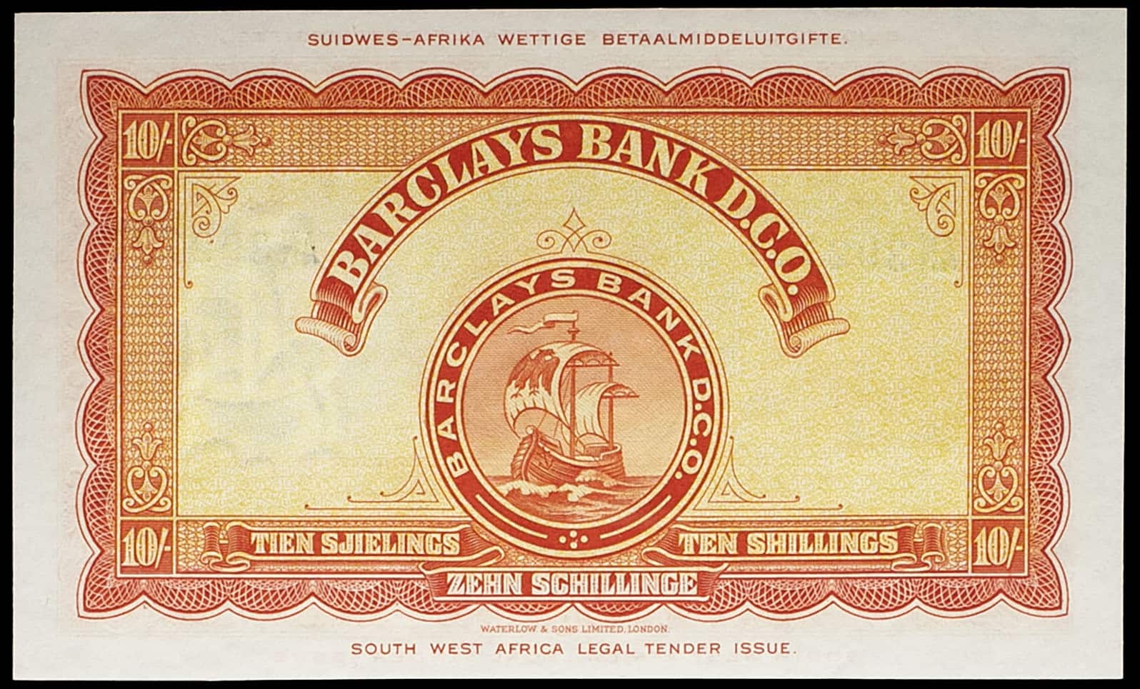 - SOUTH WEST AFRICA 10 shillings - Barclays Bank D.C.O. 30 novembre 1954.