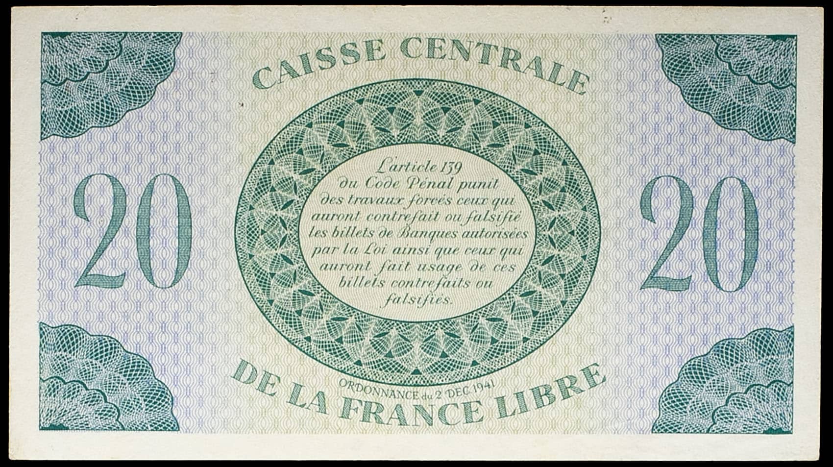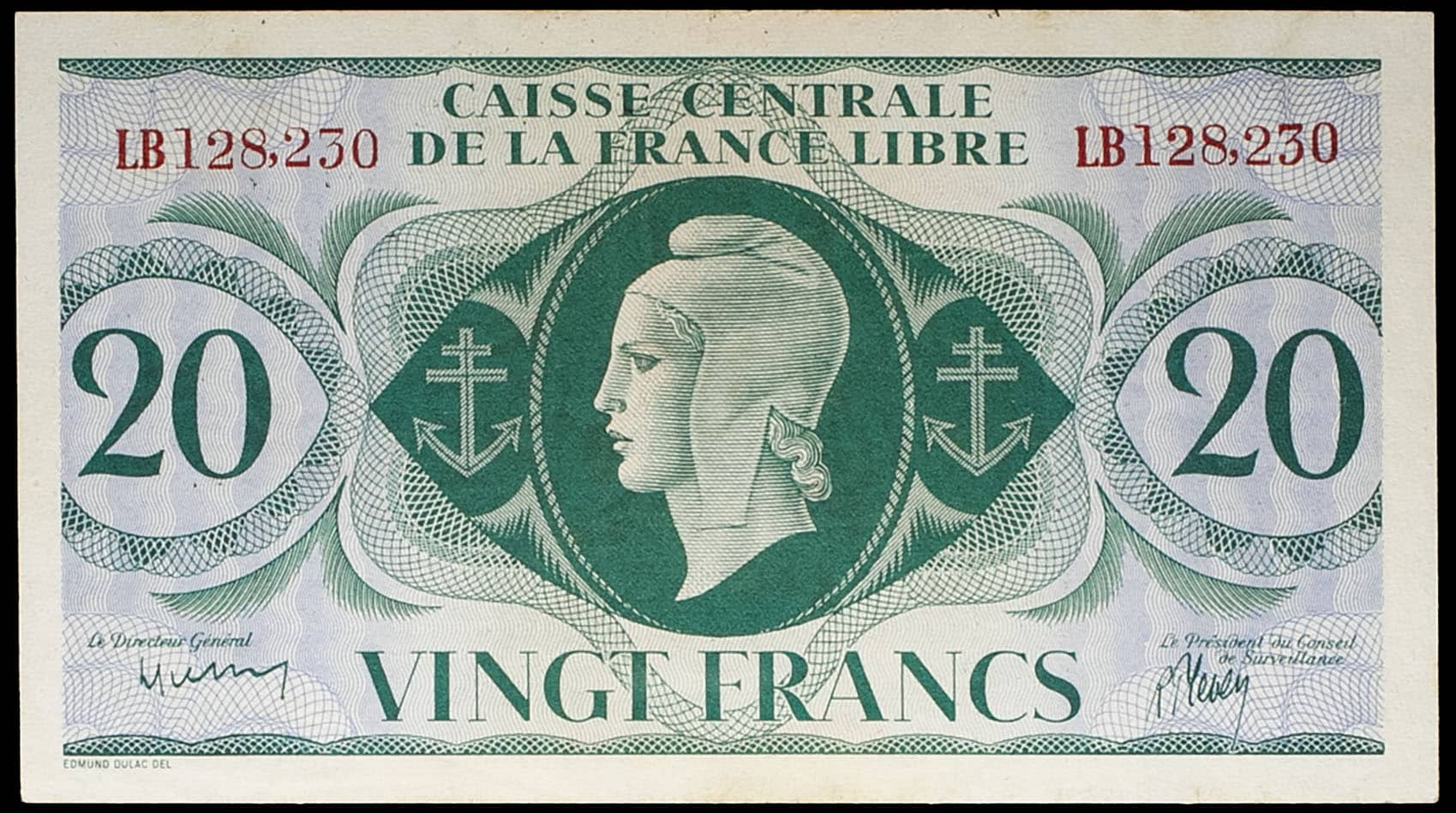 - FRENCH EQUATORIAL AFRICA 20 francs type "Marianne” dit “Edmond Dulac" - Caisse centrale de la France libre 2 décembre 1941 (23 novembre 1944).