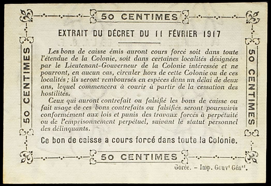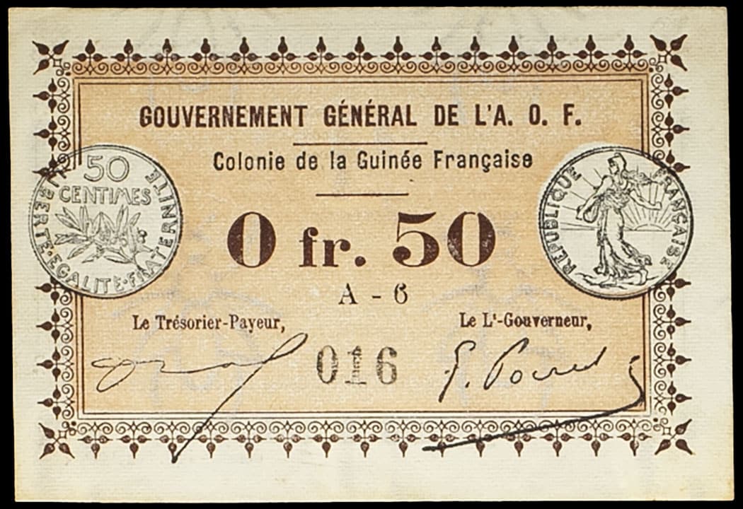 - FRENCH WEST AFRICA 0,50 franc / 50 centimes type “brun” - Colonie de la Guinée Française, Gouvernement général de l’A.O.F. 11 février 1917.
