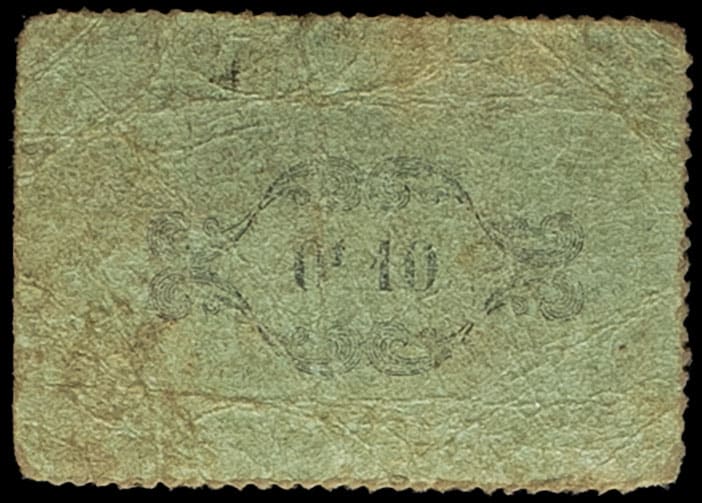 Pas de numéro. Timbre collé sur papier cartonné vert, avec surcharge “VALEUR D’ÉCHANGE” au recto et “0f 10” imprimé au verso. Type rare et recherché ! Seuls sept exemplaires au total sont référencés dans la base de population PMG à ce jour !