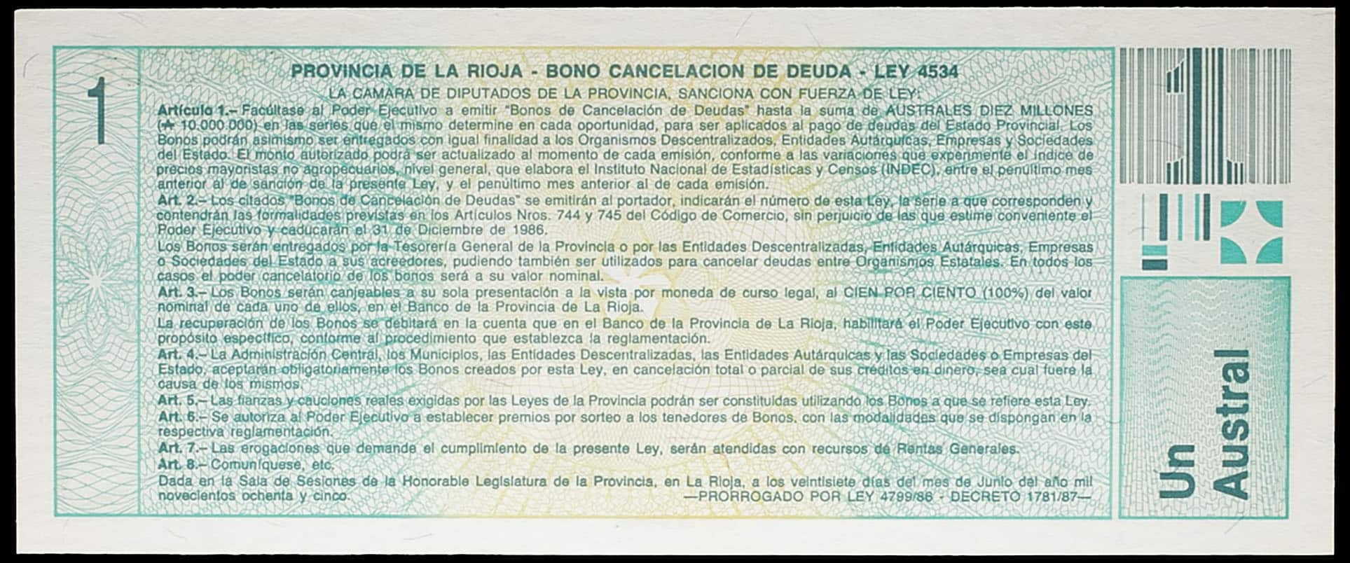 - ARGENTINA 1 austral type “Juan Facundo Quiroga” - Provincia de la Rioja ND (1986).