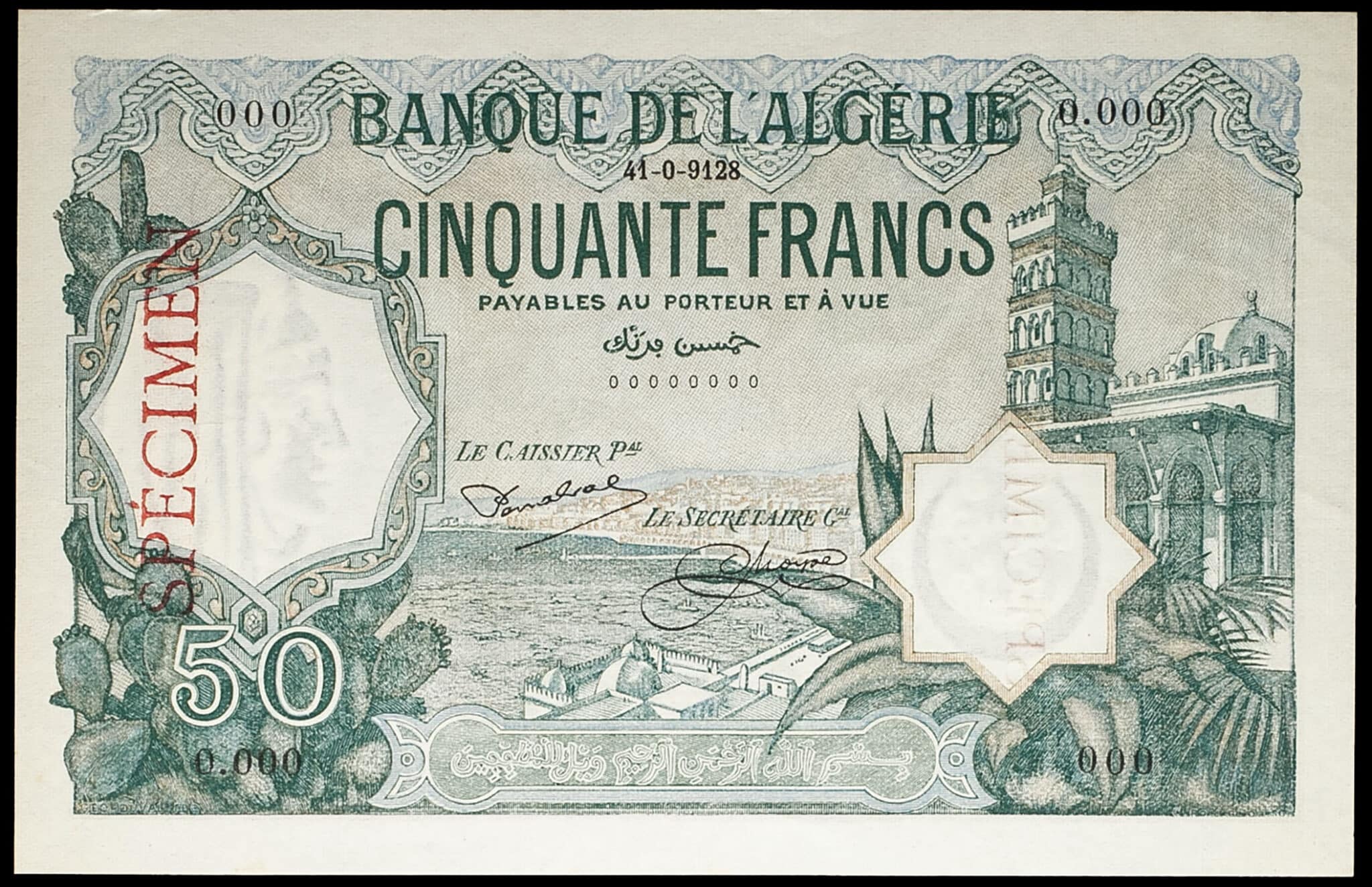 - ALGERIA 50 francs type “vert” (SPÉCIMEN) daté 41-0-9128 (1924-1933).
