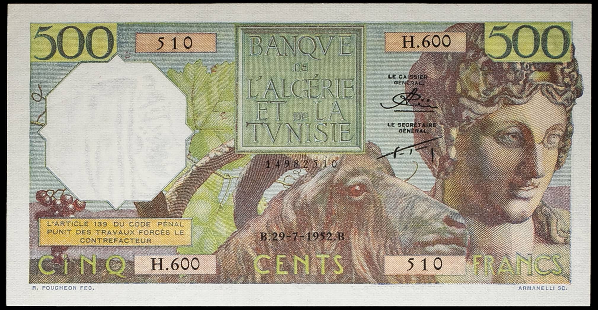 - ALGERIA 500 francs type “Bacchus” 29-7-1952.