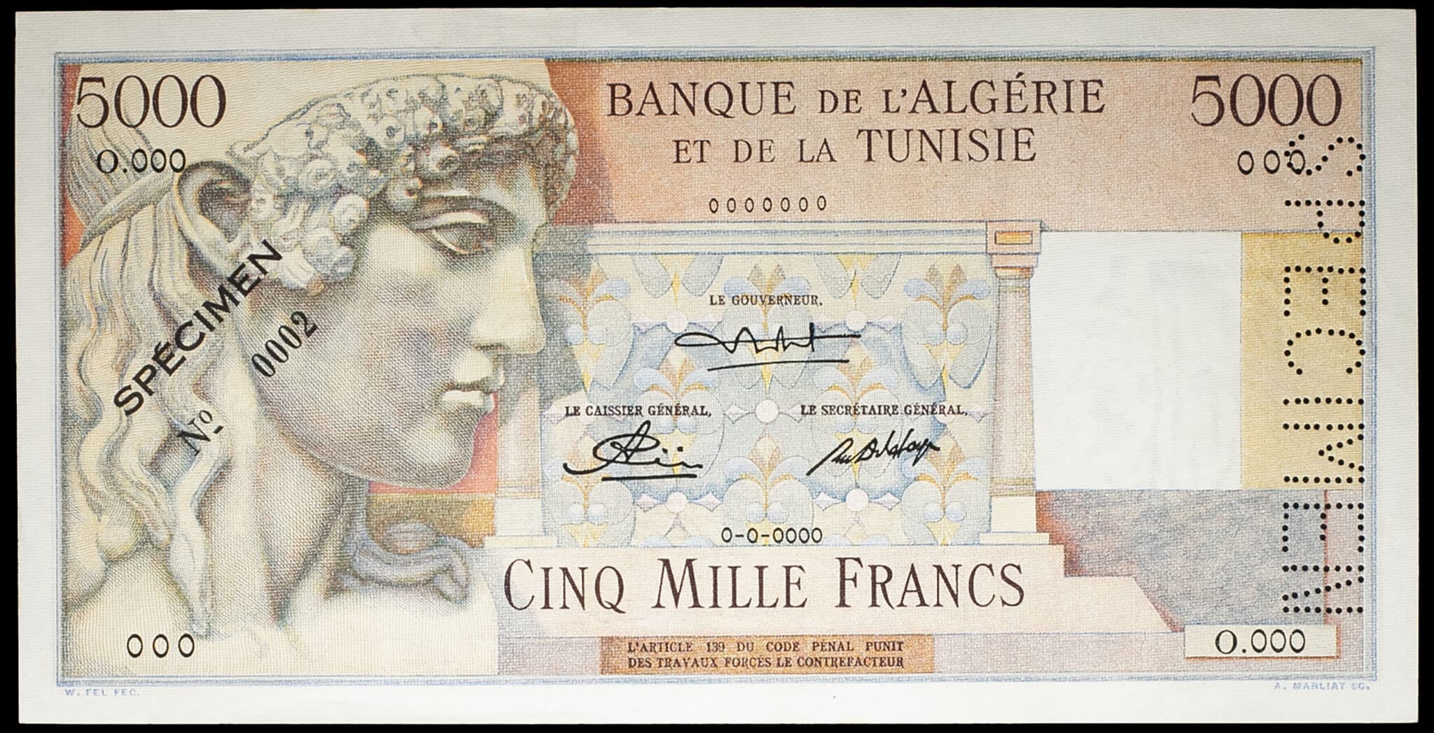 - ALGERIA 5000 francs type “Apollon” modifié (SPÉCIMEN) ND (1949).