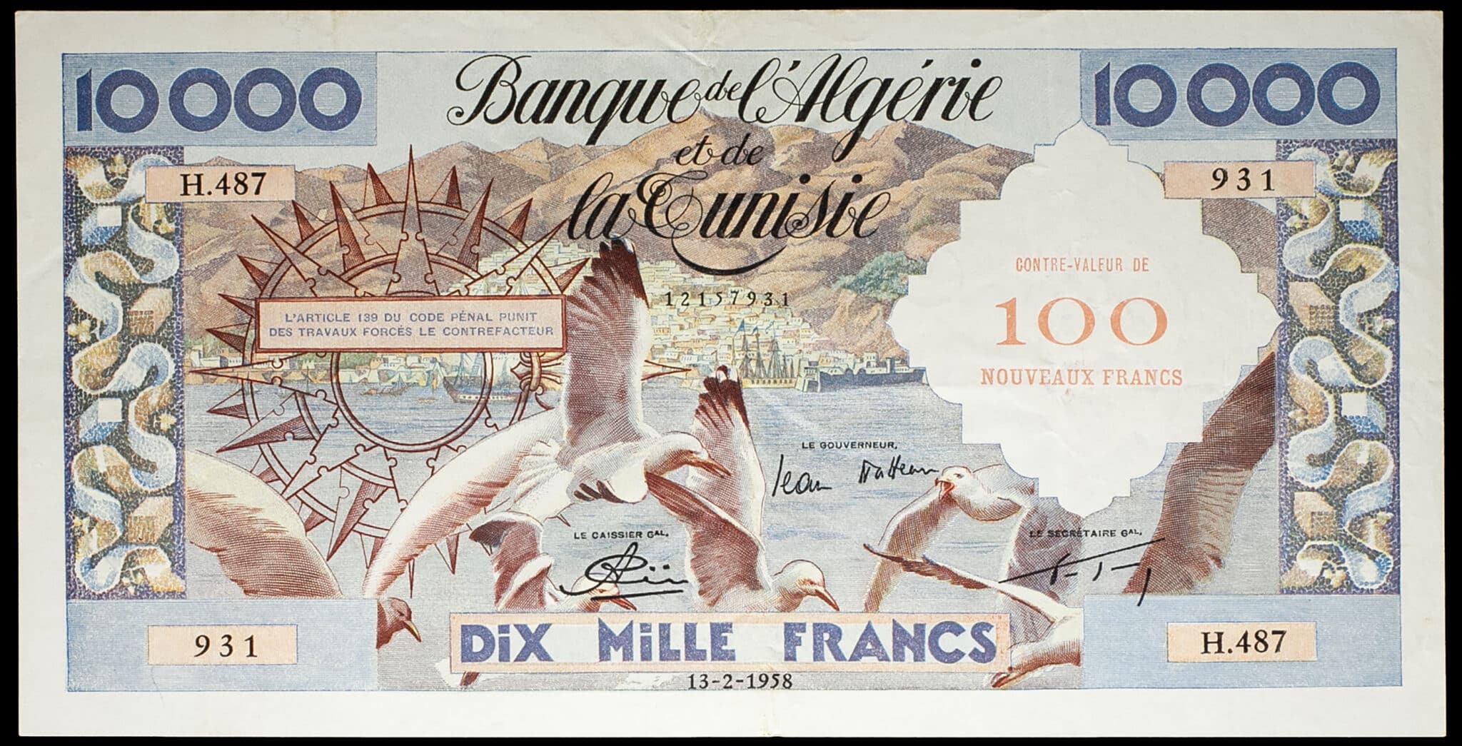 - ALGERIA 100 nouveaux francs surchargé sur 10 000 francs type “mouettes” 13-2-1958.