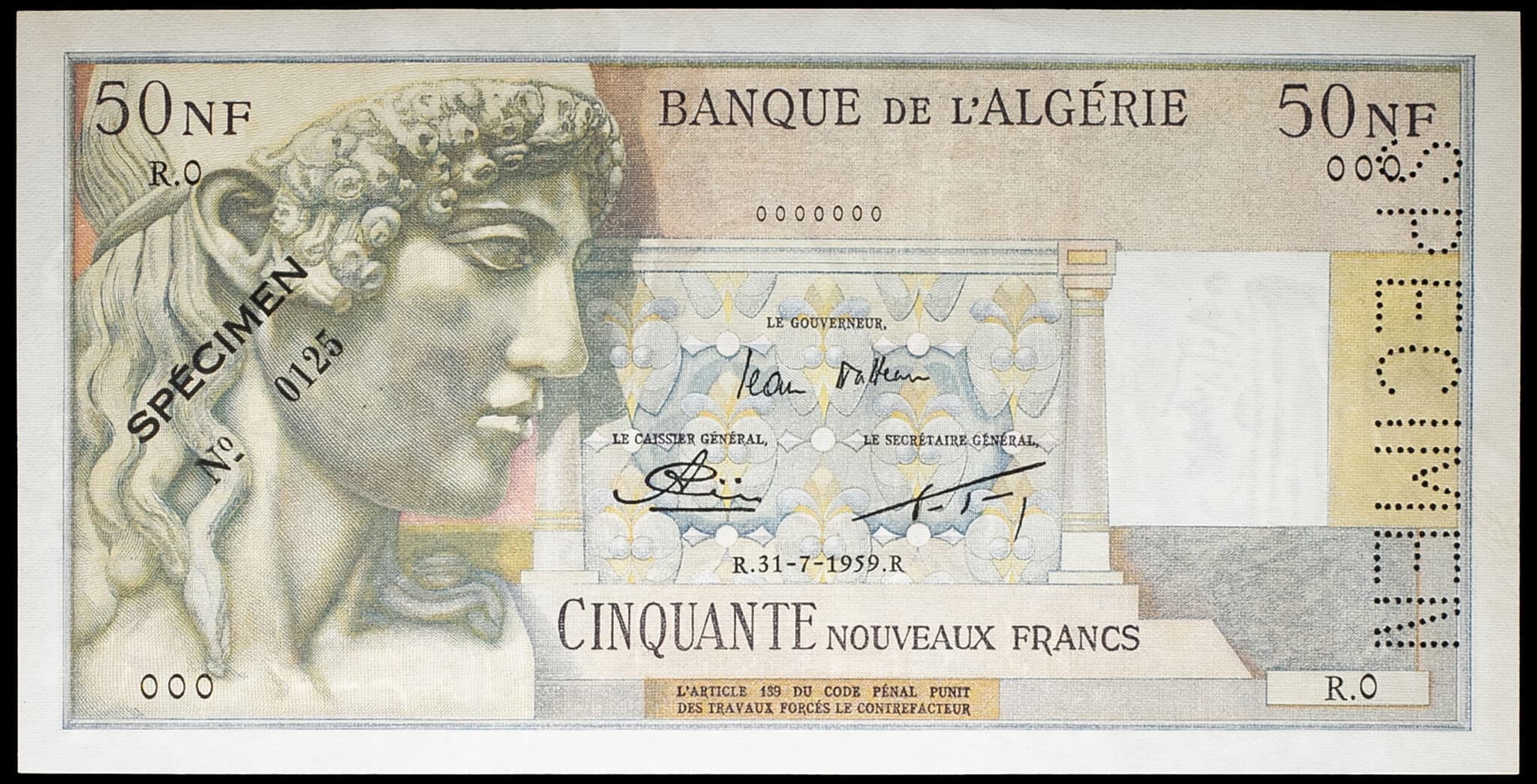 - ALGERIA 50 nouveaux francs type “Bacchus” (SPÉCIMEN) 31-7-1959.