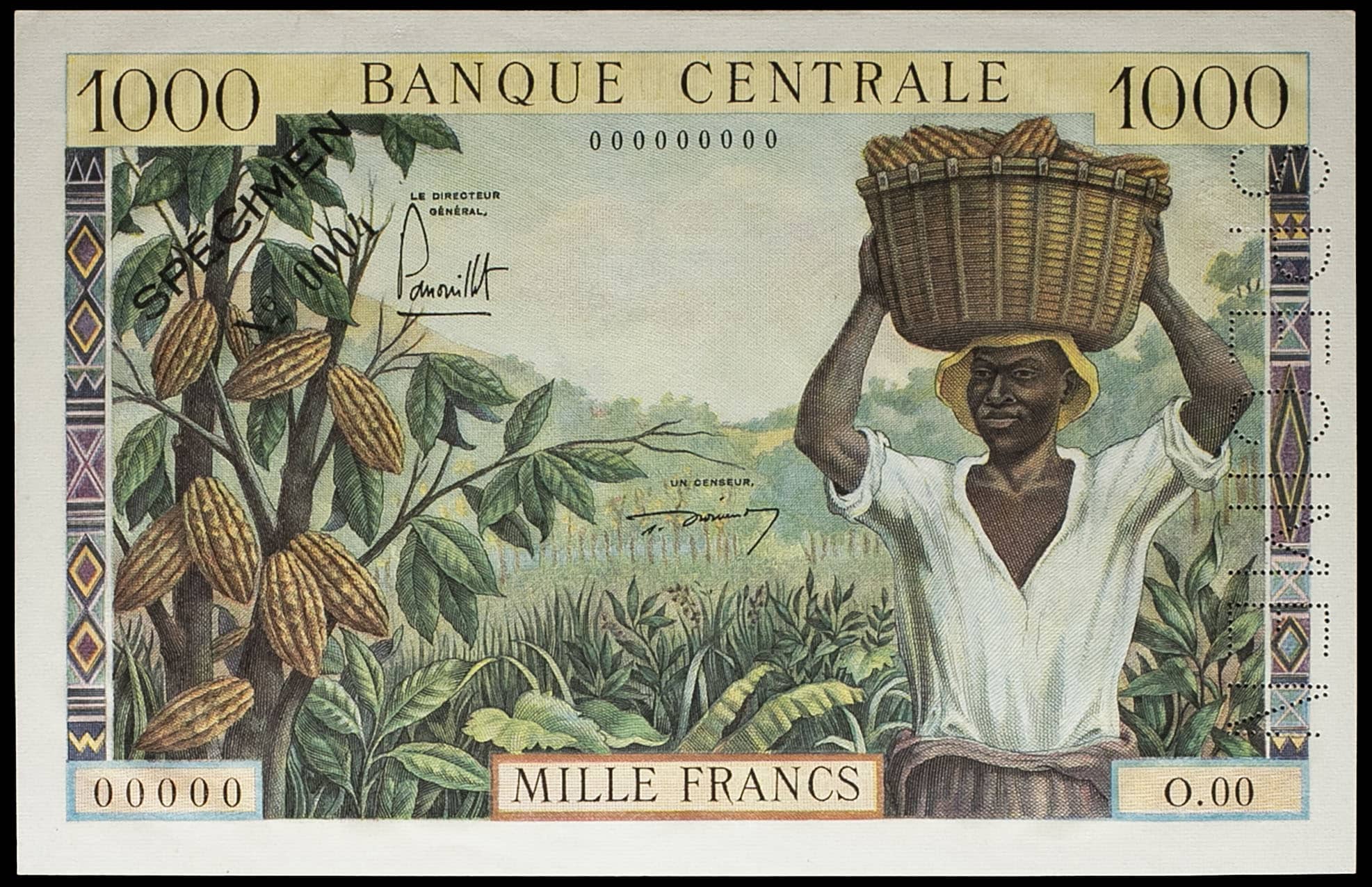 - CAMEROON 1000 francs type “plantation de cacao” (SPÉCIMEN) ND (1960).
