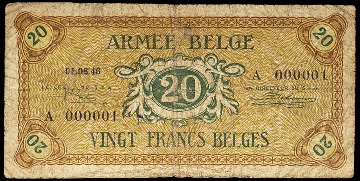 - BELGIUM 20 francs type “Armée Belge” avec premier numéro 000001 01-08-1946.
