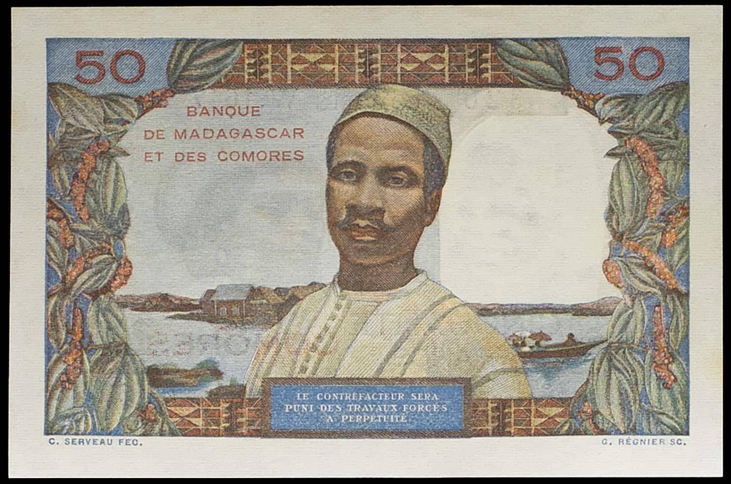 - COMOROS 50 francs type “femme Betsileo” surchargé “” ND (1960).