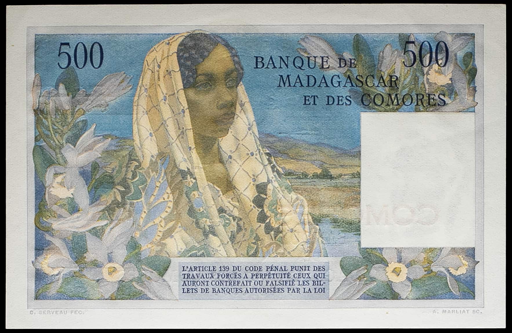- COMOROS 500 francs type “Comorien” surchargé “” ND (1963).