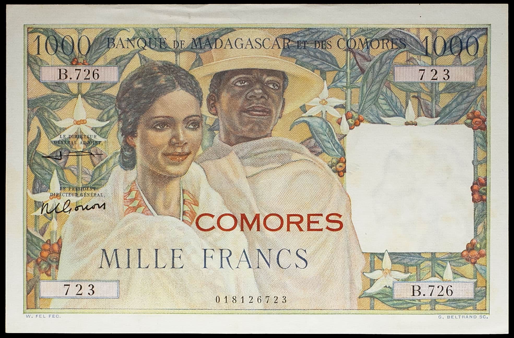 - COMOROS 1000 francs type “couple indigène des Hauts Plateaux” surchargé “” ND (1963).
