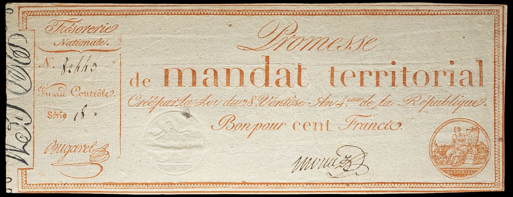 - Mandat territorial de 100 francs 28 Ventôse an 4.