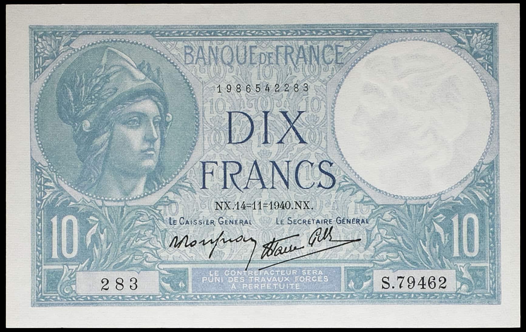 - 10 francs type “Minerve” modifié 14-11-1940.