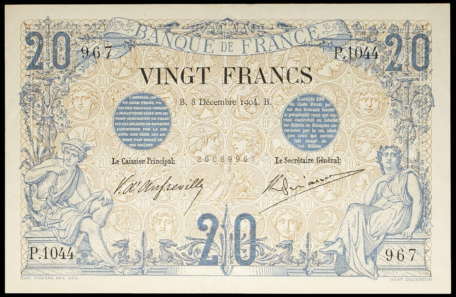C’est le second plus haut grade ! Alphabet P.1044 - numéro 967. Signatures : D’Anfreville / Giraud. Type rare et recherché dans cet état de conservation ! Un seul exemplaire est référencé dans une qualité supérieure dans la base de population PMG à ce jour ! (1x PMG 64 : Top Pop). Cet exemplaire provient de la vente “e-Billets 1” de CGB, adjugé 2950 EUR avec les frais en février 2015.