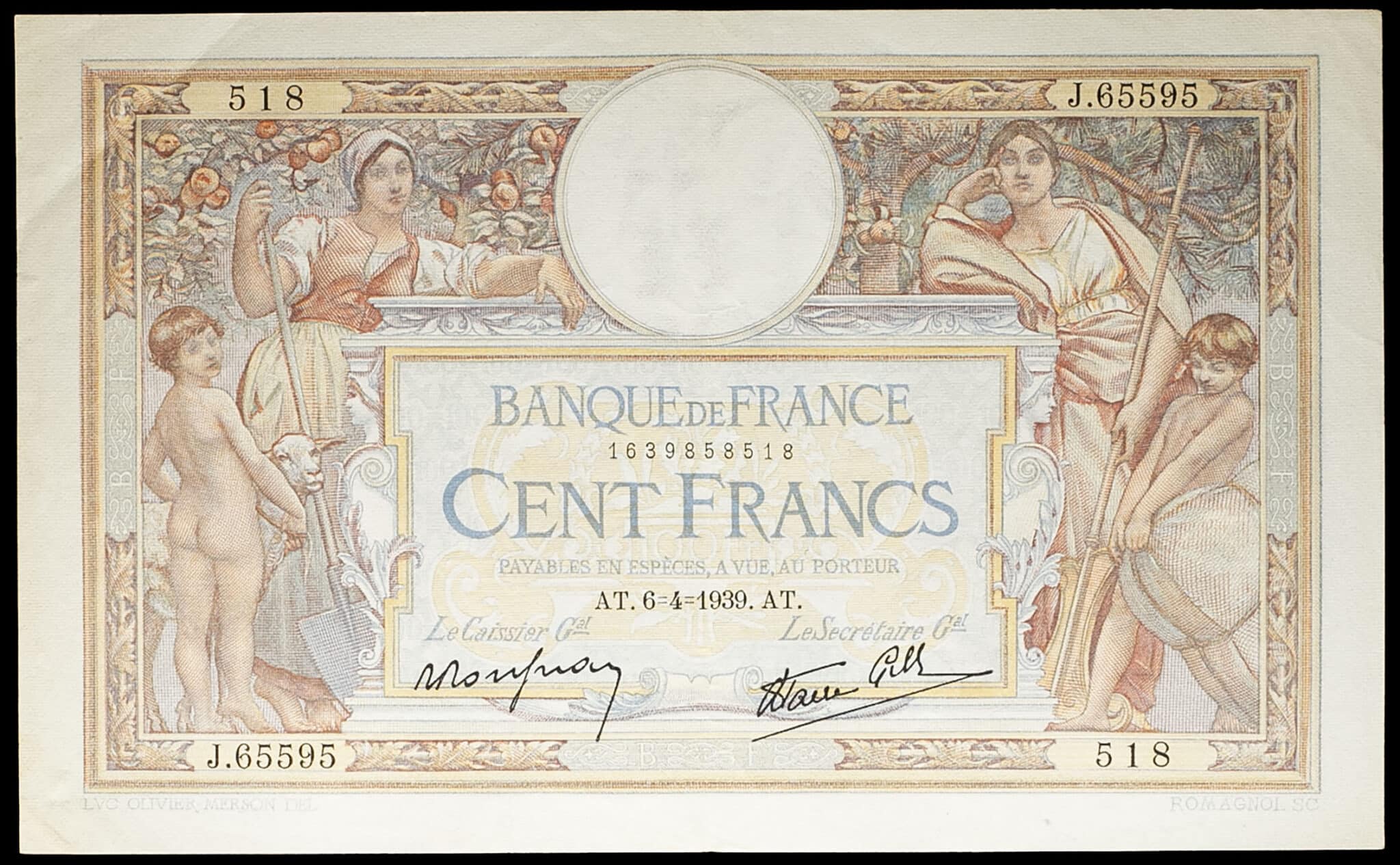 - 100 francs type “Luc-Olivier Merson” modifié avec grands cartouches 6-4-1939.