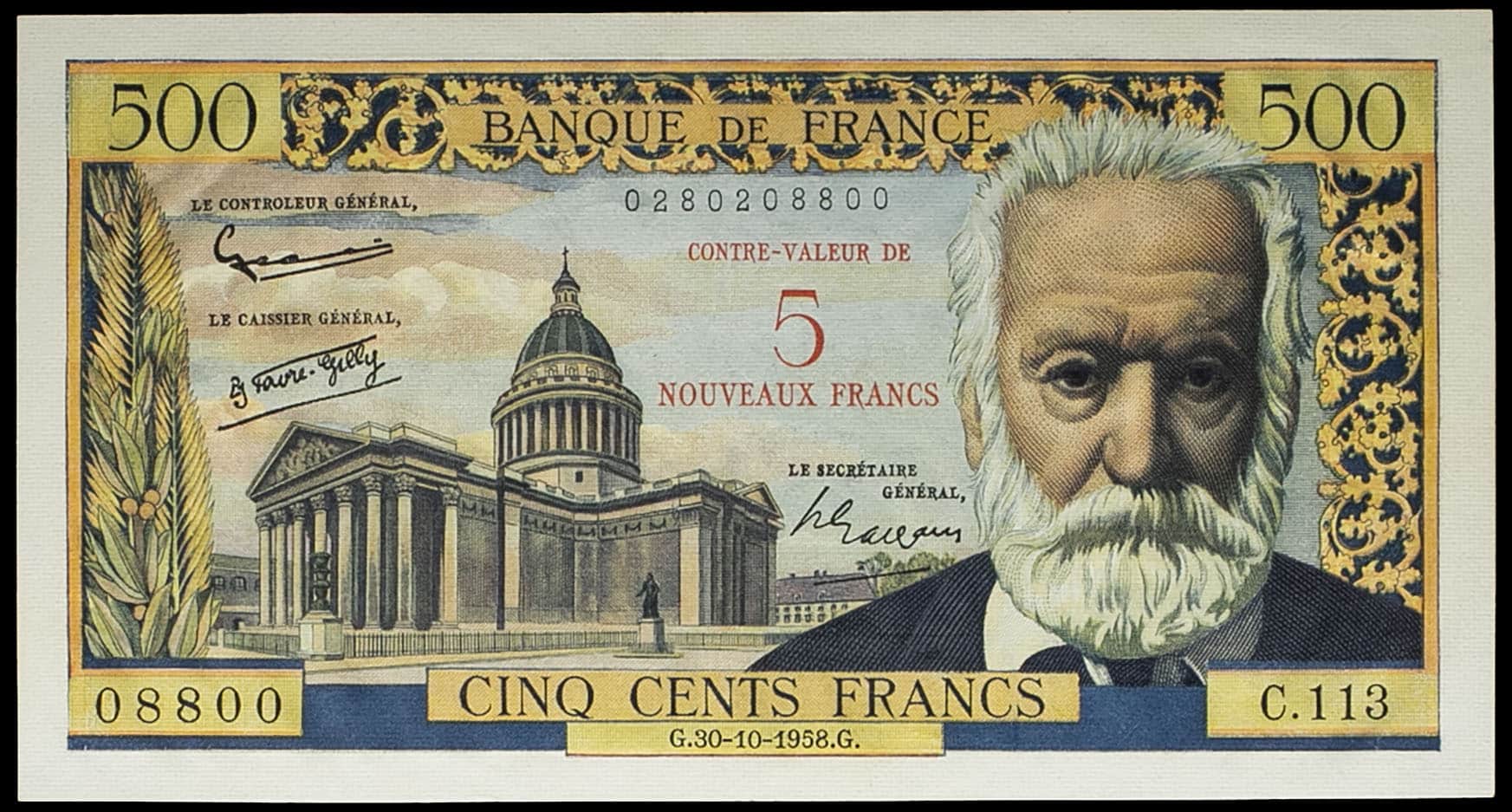 - 5 nouveaux francs surchargé sur 500 francs type “Victor Hugo” 30-10-1958.