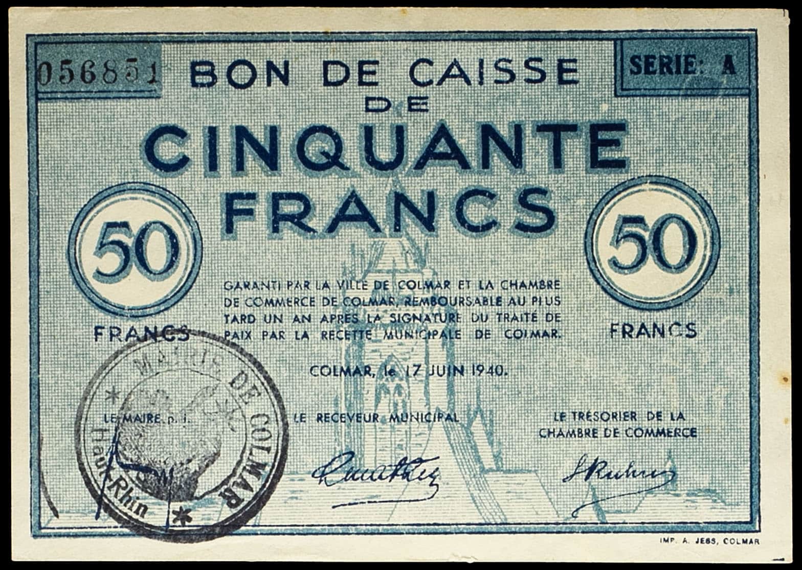 - Bon de caisse de 100 francs - Chambre de commerce de Colmar 17 juin 1940.