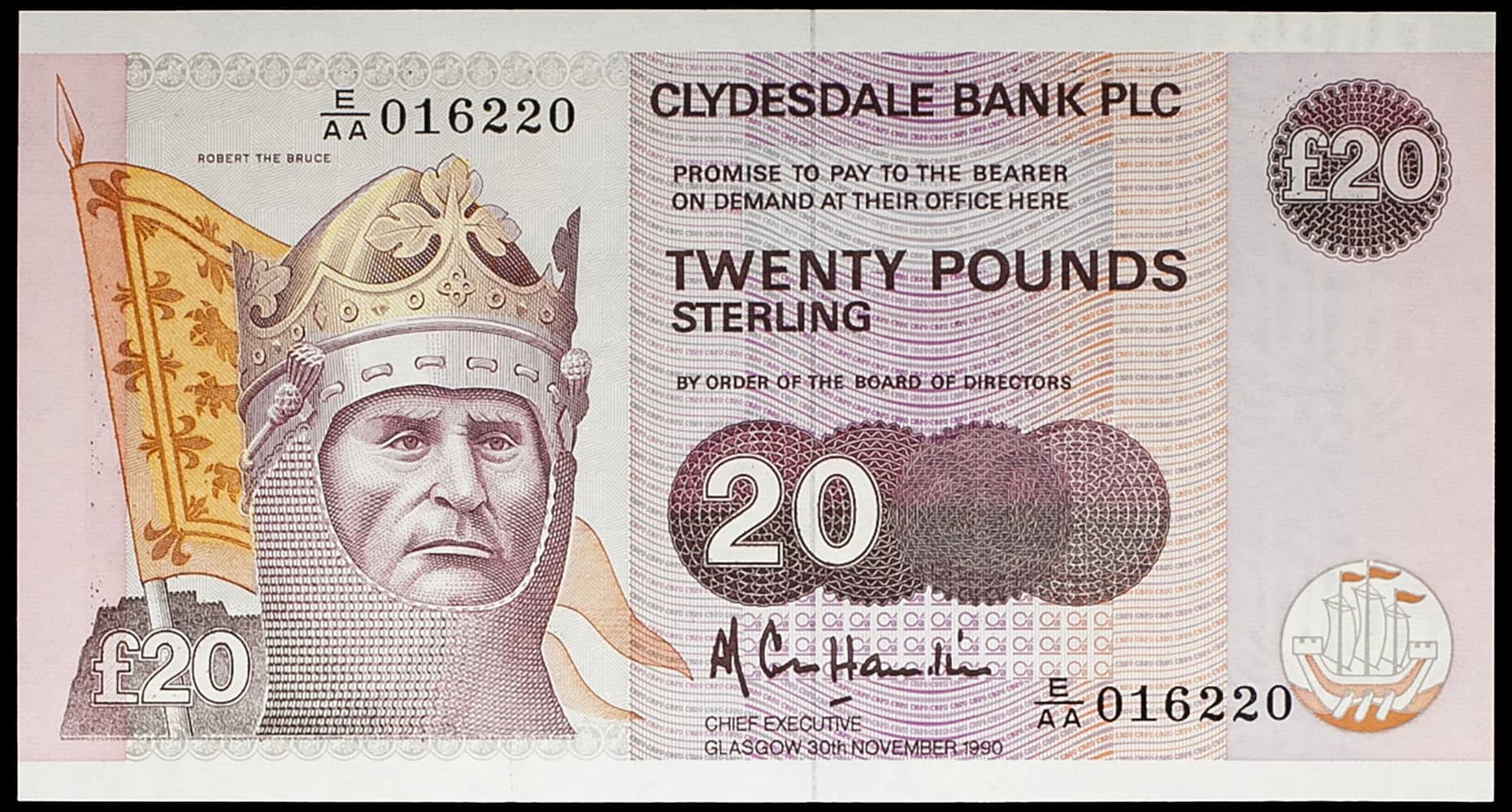 - UNITED KINGDOM Écosse, 20 pounds avec le portrait de Robert Bruce - Clydesdale Bank 30 novembre 1990.