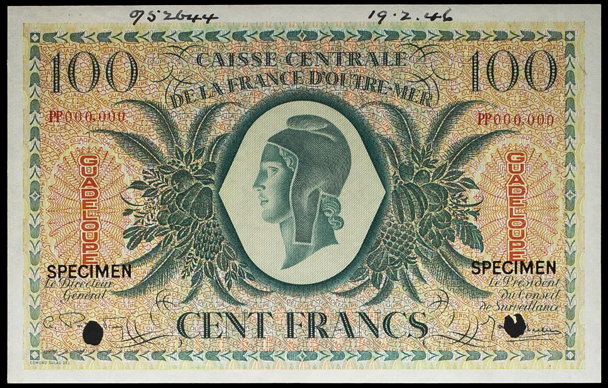 Alphabet PP - numéro 000,000. Double surcharge horizontale “GUADELOUPE” au-dessus des signatures. Perforation par un trou sur chacune des signatures. Numérotation manuscrite au stylo noir en marge supérieur, avec la date (19.2.46).
