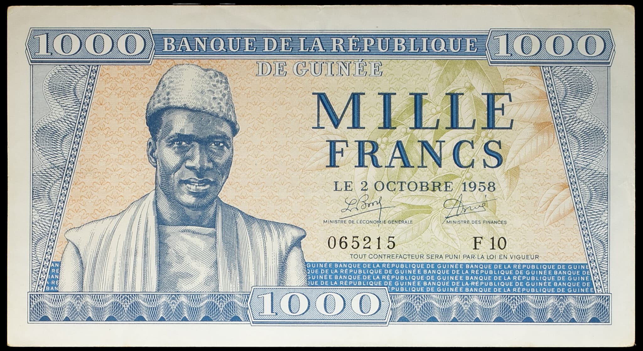 - GUINEA 1000 francs avec le portrait du président Ahmed Sekou Touré 2 octobre 1958.