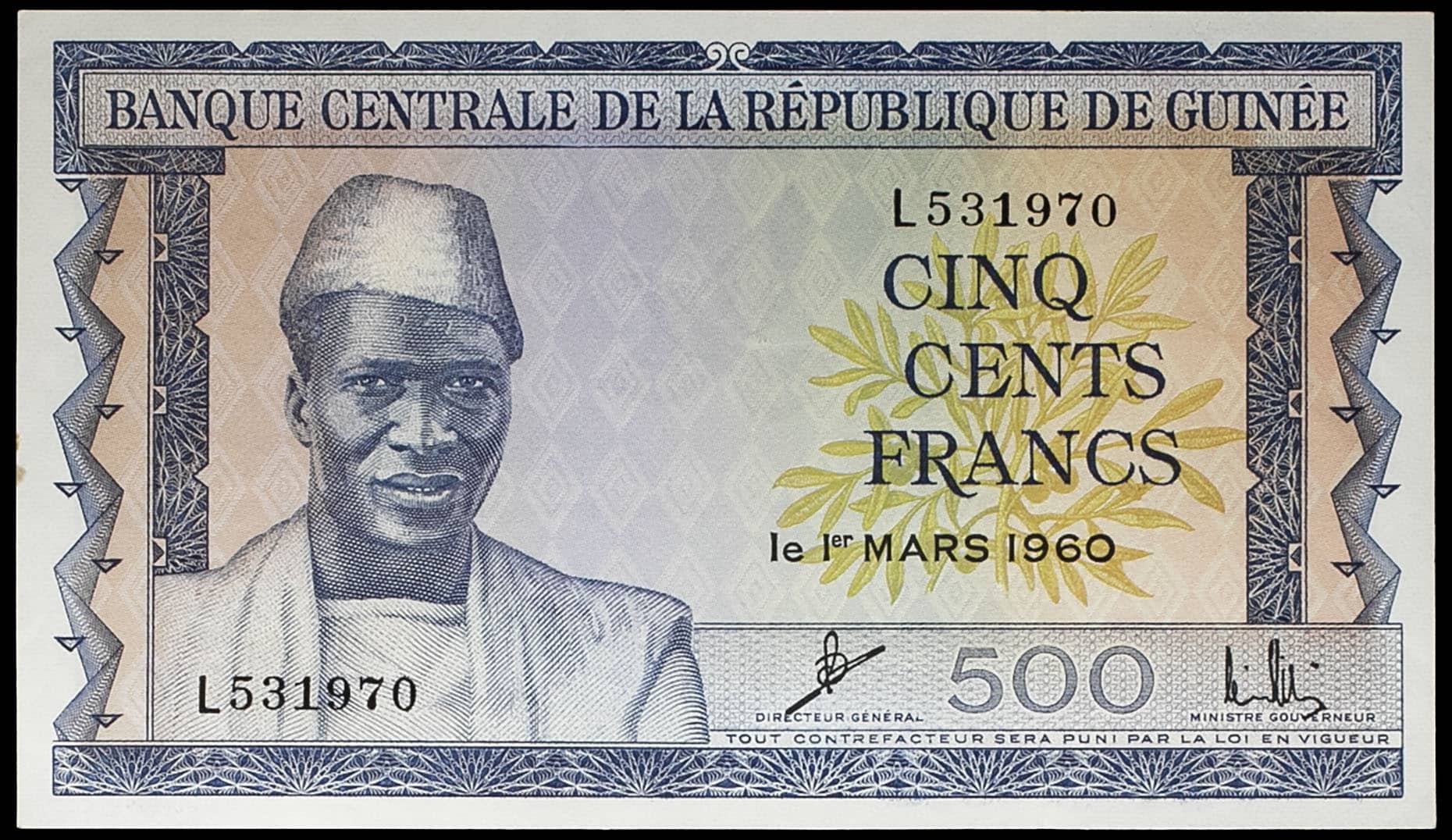 - GUINEA 500 francs avec le portrait du président Ahmed Sekou Touré 1er mars 1960.