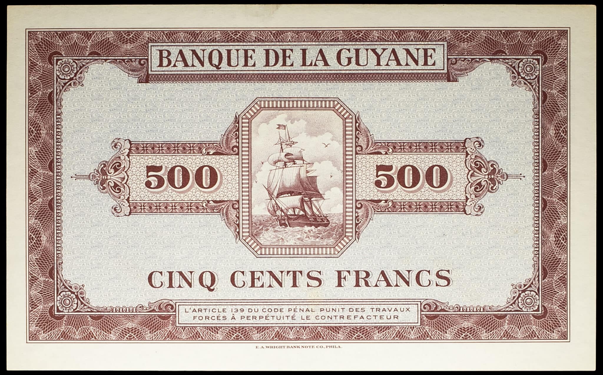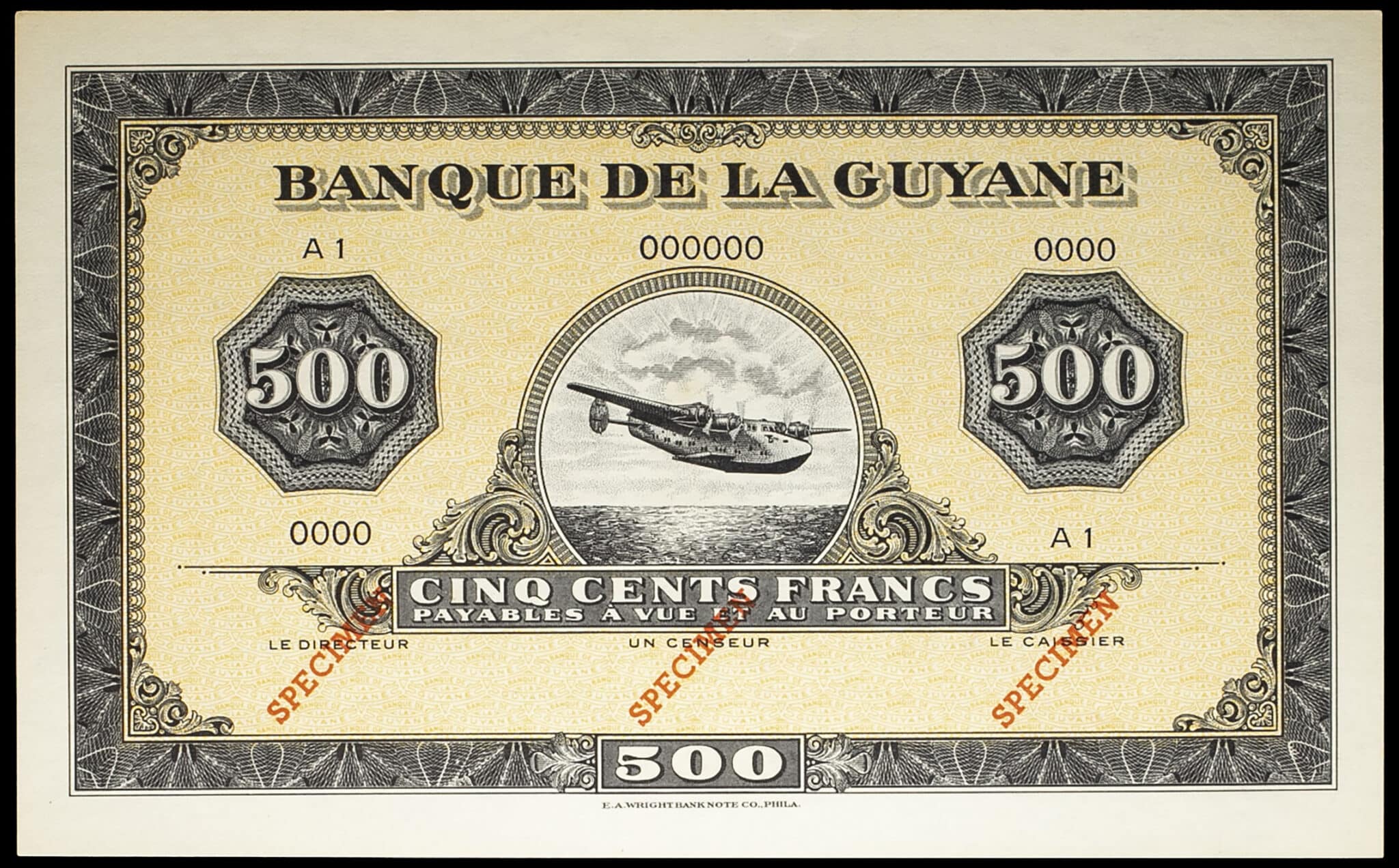 - FRENCH GUIANA 500 francs impression US type “hydravion” (SPÉCIMEN) ND (1942).