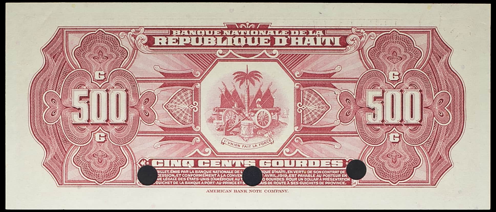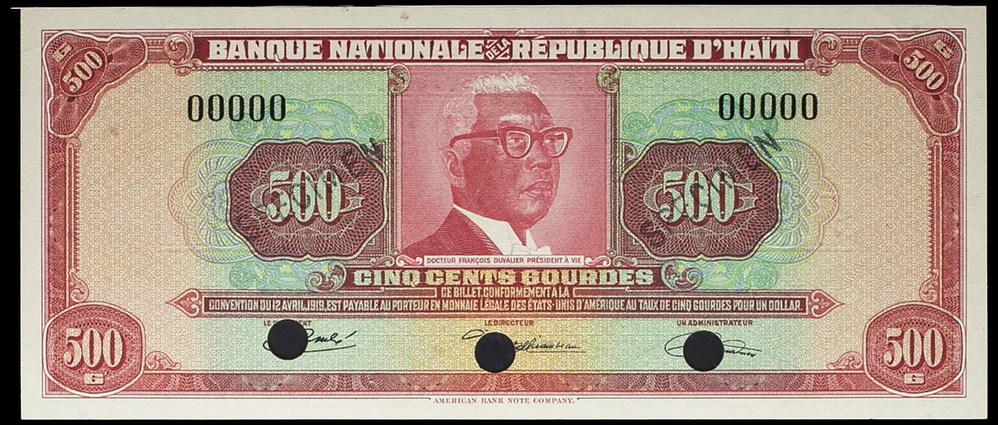 - HAITI 500 gourdes avec le portrait du président François Duvalier (SPÉCIMEN) ND (1967-1973).