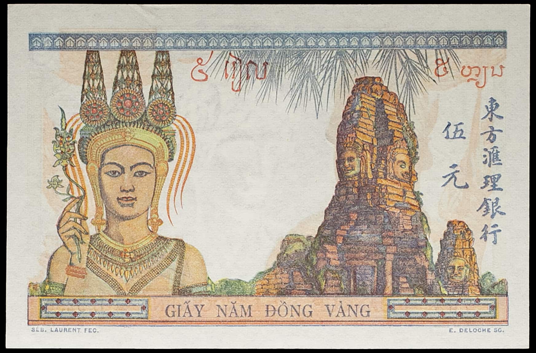 - FRENCH INDOCHINA 5 piastres type “femme casquée” modifié ND (1945).