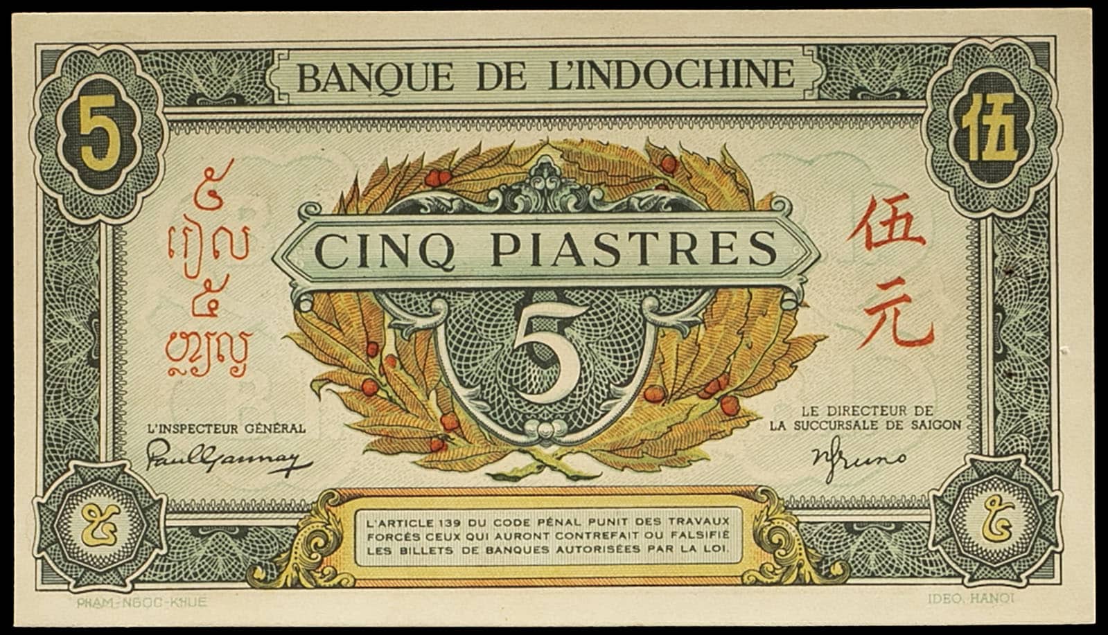 - FRENCH INDOCHINA 5 piastres impression I.D.E.O. type “vert” ND (1943).