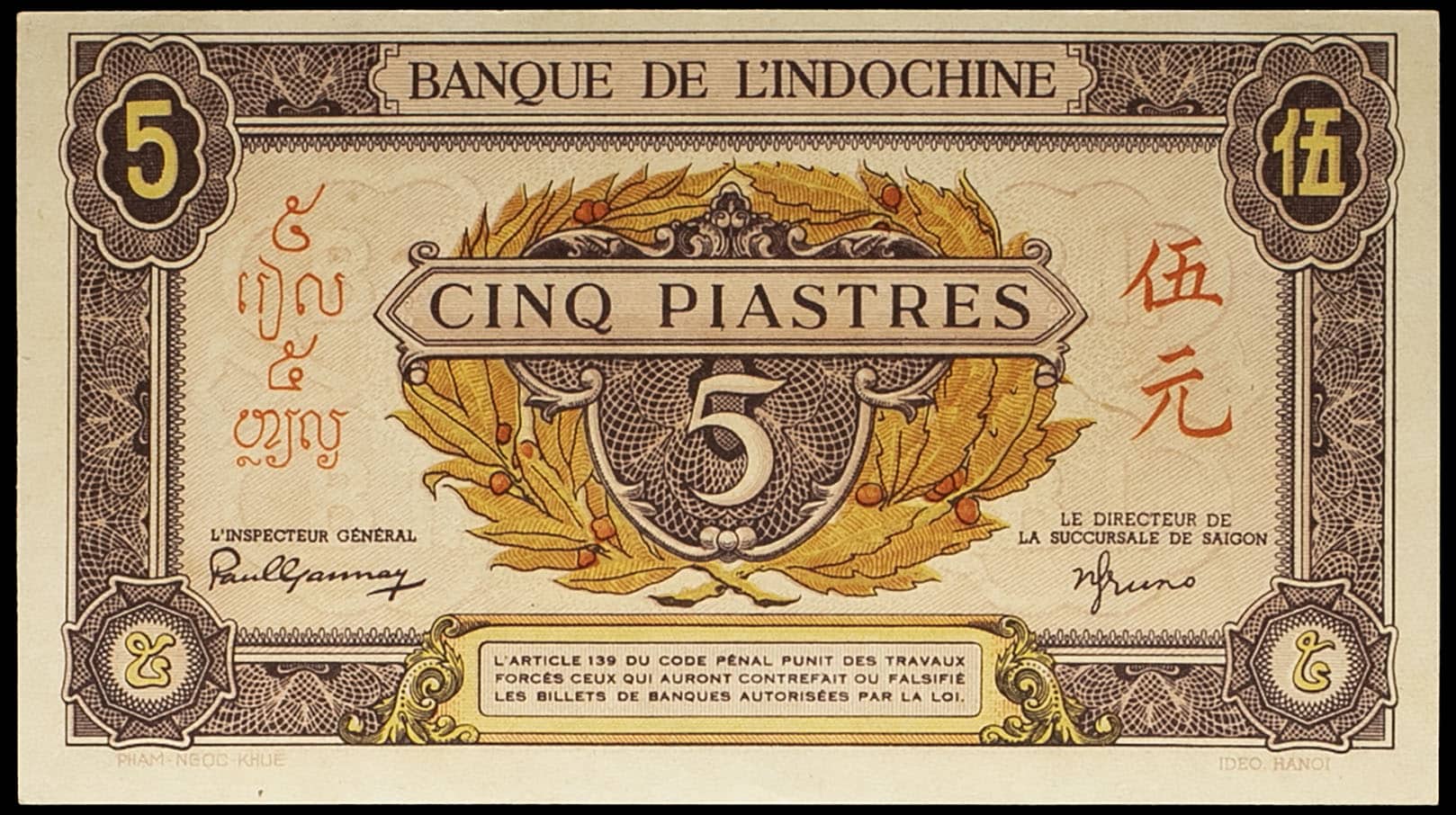 - FRENCH INDOCHINA 5 piastres impression I.D.E.O. type “mauve”, deuxième émission ND (1944).