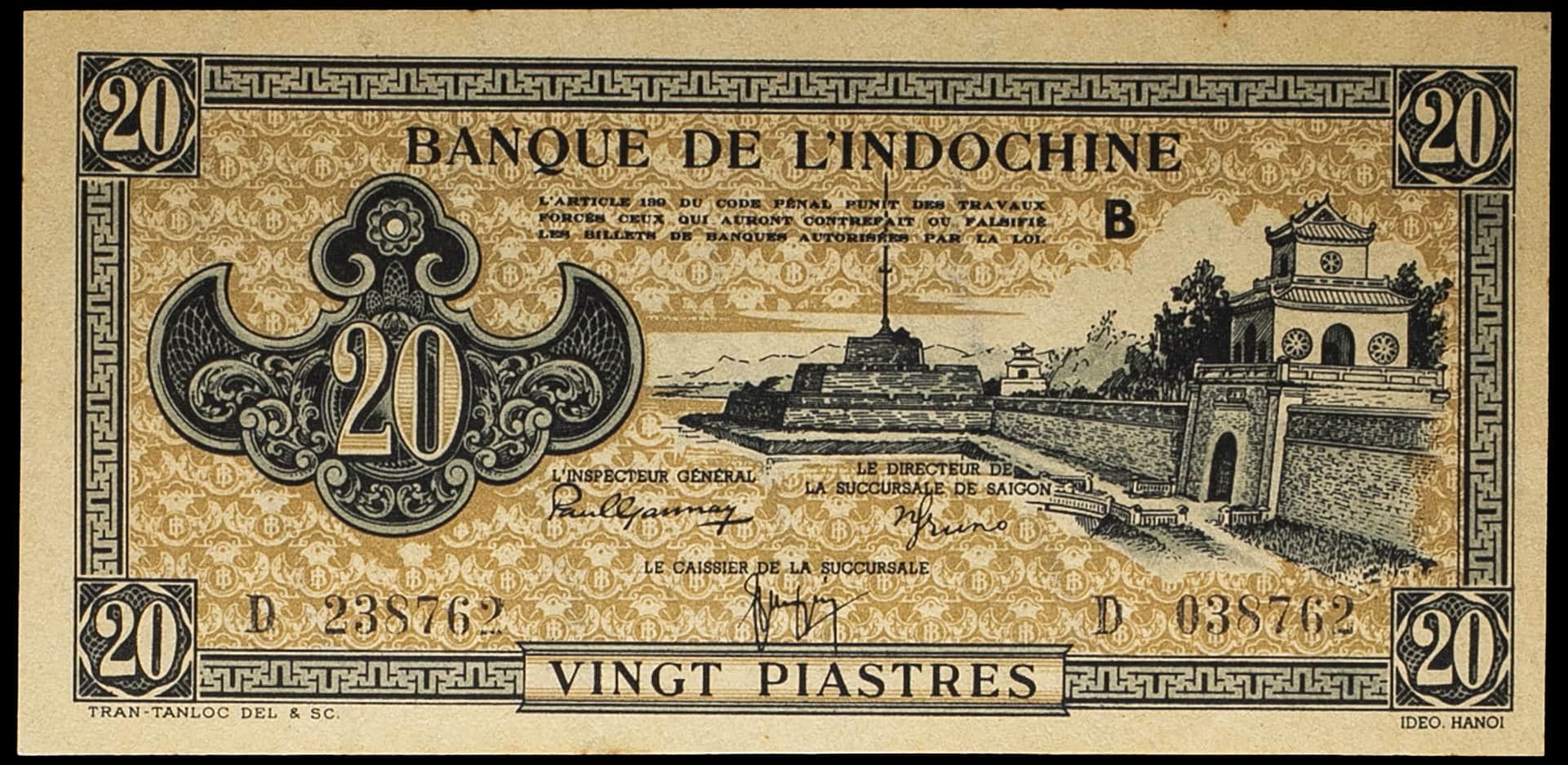 - FRENCH INDOCHINA 20 piastres impression I.D.E.O. type “ocre”, troisième émission ND (1945).